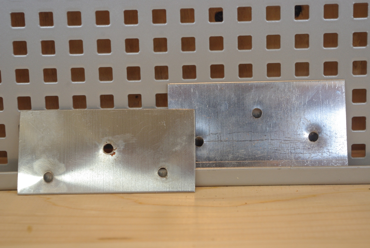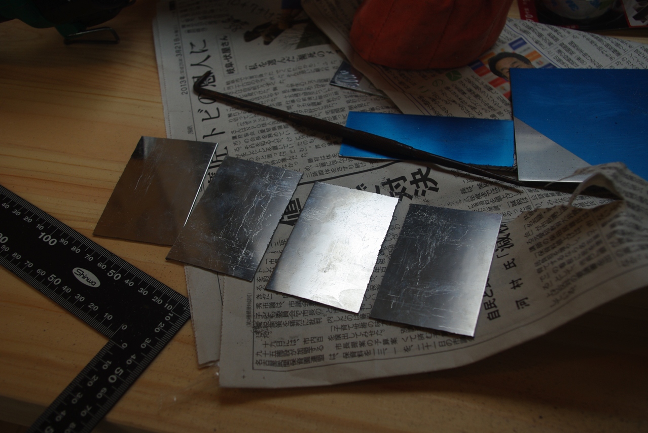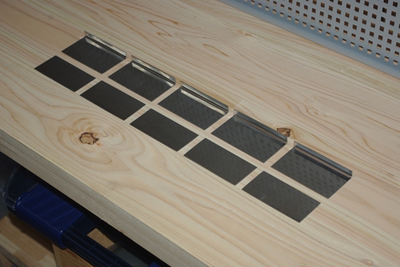 金具のサイズは、パネルの上辺の長さと、私の小さな万力のサイズをもとに大体75o×50oの長方形の板を5枚切り出しました。