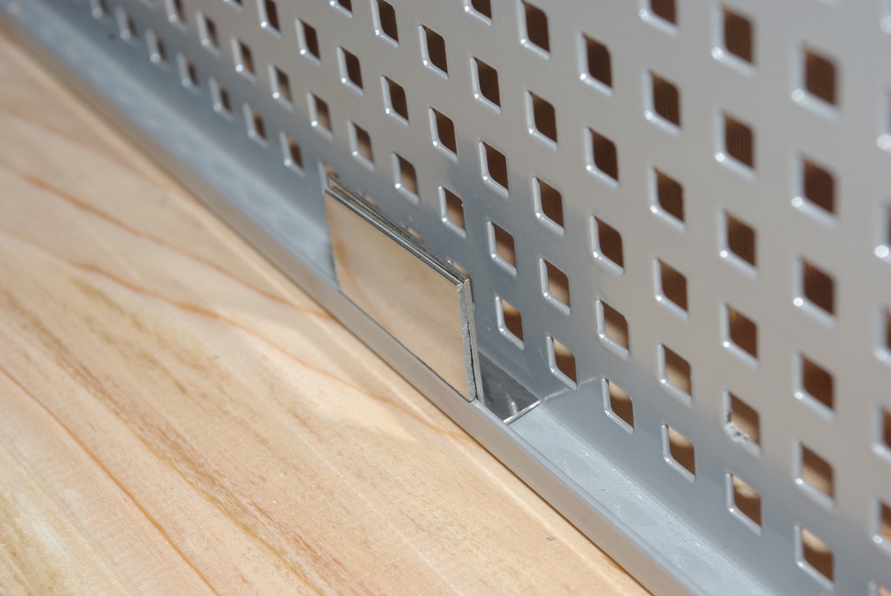 このフック金具は、一番最後にパネルのパーフォレーションを通して木ねじで壁に取り付けるため、ネジ穴もパーフォレーションの位置に合わせて開けてあります。