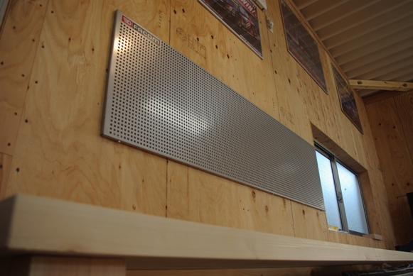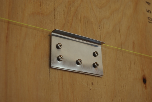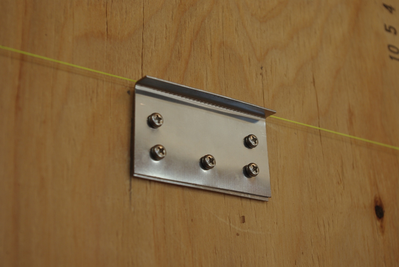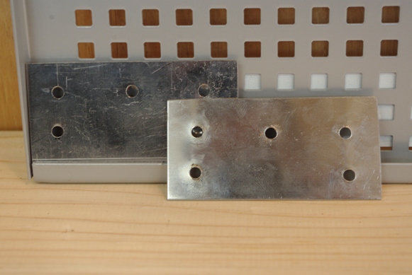 このパネル上辺固定用の金具は最初に壁に固定しますので、予め固定する木ねじ穴の位置は、パネルの取り付け位置から測って、パーフォレーションを避けて金具に開けてあります。