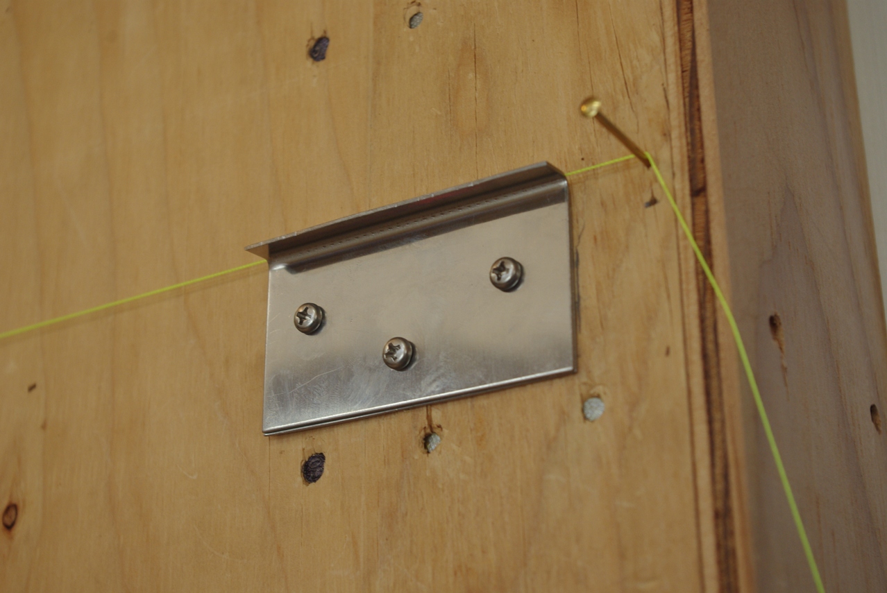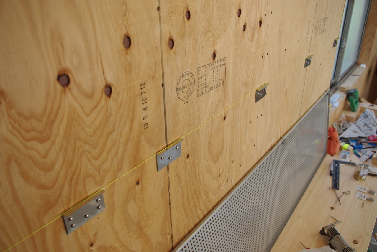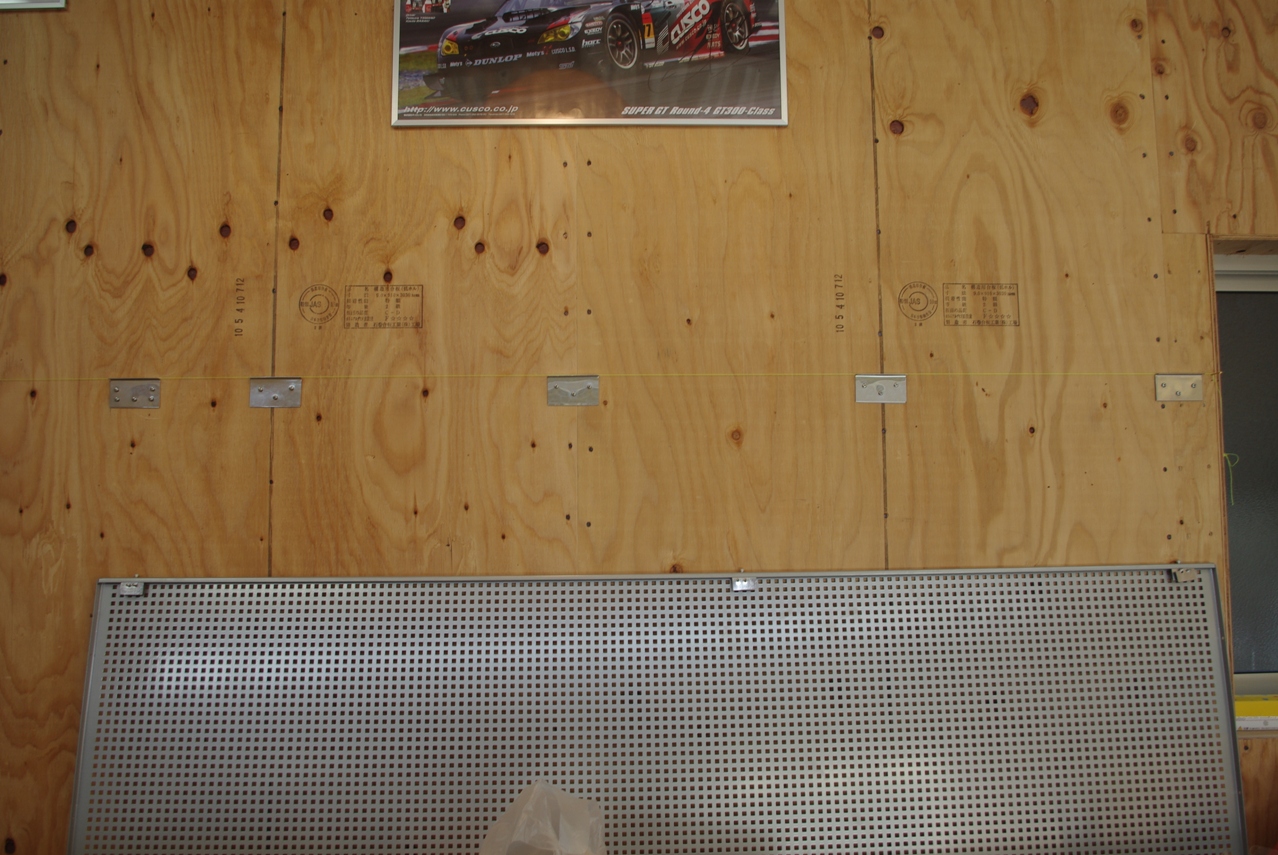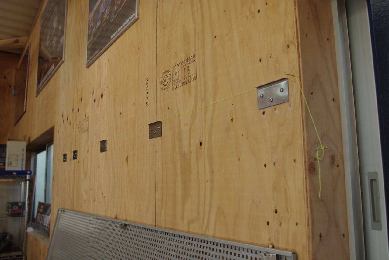 壁に縦の黒いラインが引いてあるのは、コンパネの裏に幅の狭い間柱があるという位置を示す印なので、この位置にある金具はそれぞれ3本の木ねじの内、真ん中の1本だけ長さ30oを使用し、両側の2本は長さ14oのものを用いました。