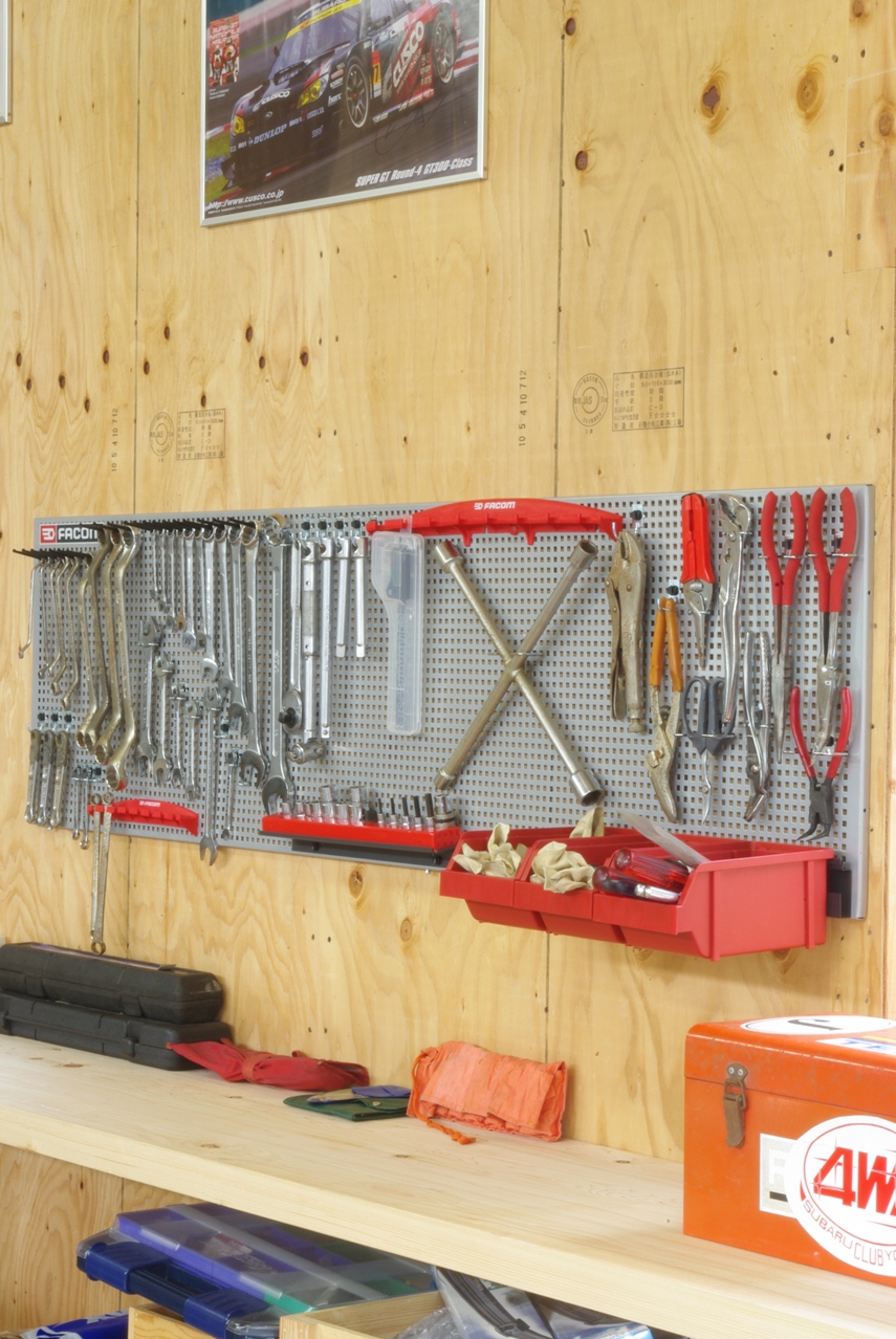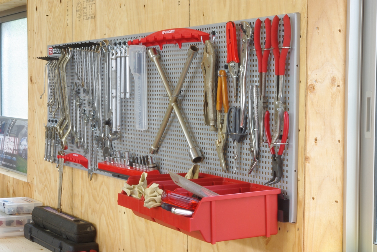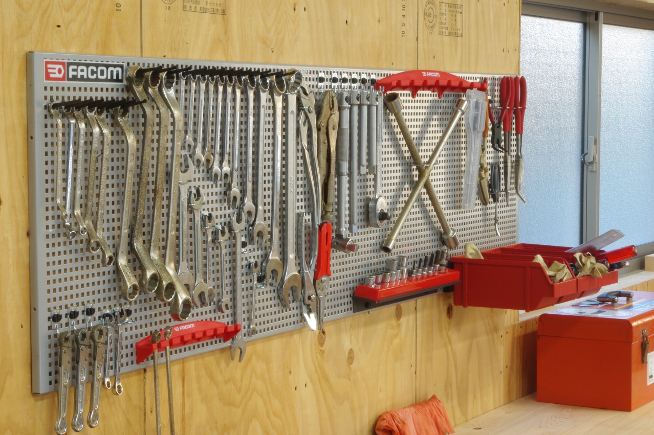それにしてもこれだけの工具を工具箱などに整理するとなると、それなりのスペースも必要になりますし、いちいち必要なものを探す手間などを考えたとき、やはりこの壁掛け式が一番理想的な収納だと思います。