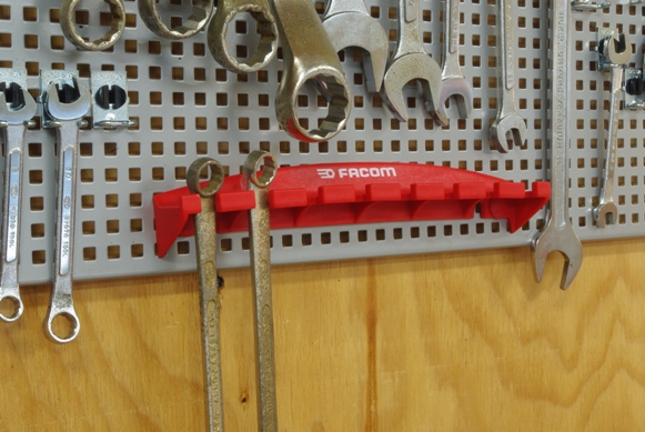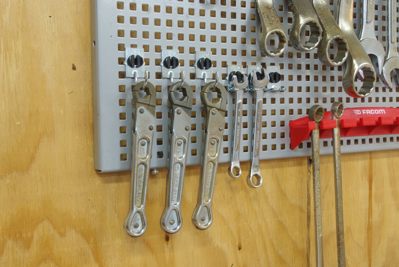 ご覧のように現在は1個のフックに工具を引っ掛けるようにして使っていますが、2個を一組にすれば両口スパナも掛けられますね。