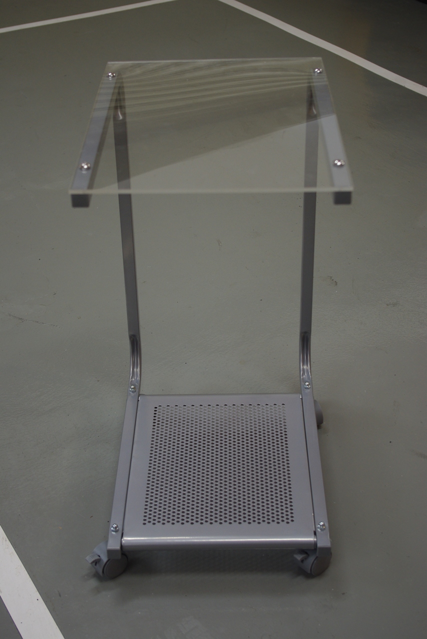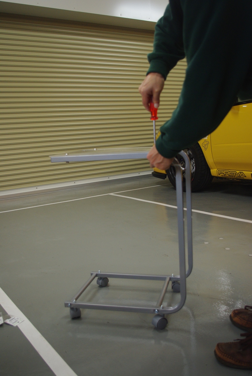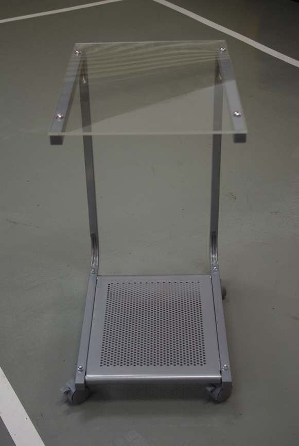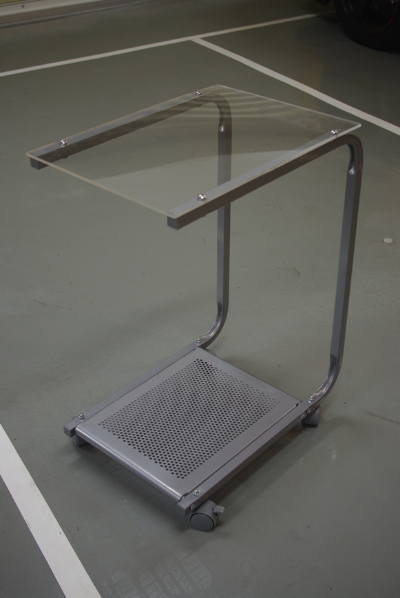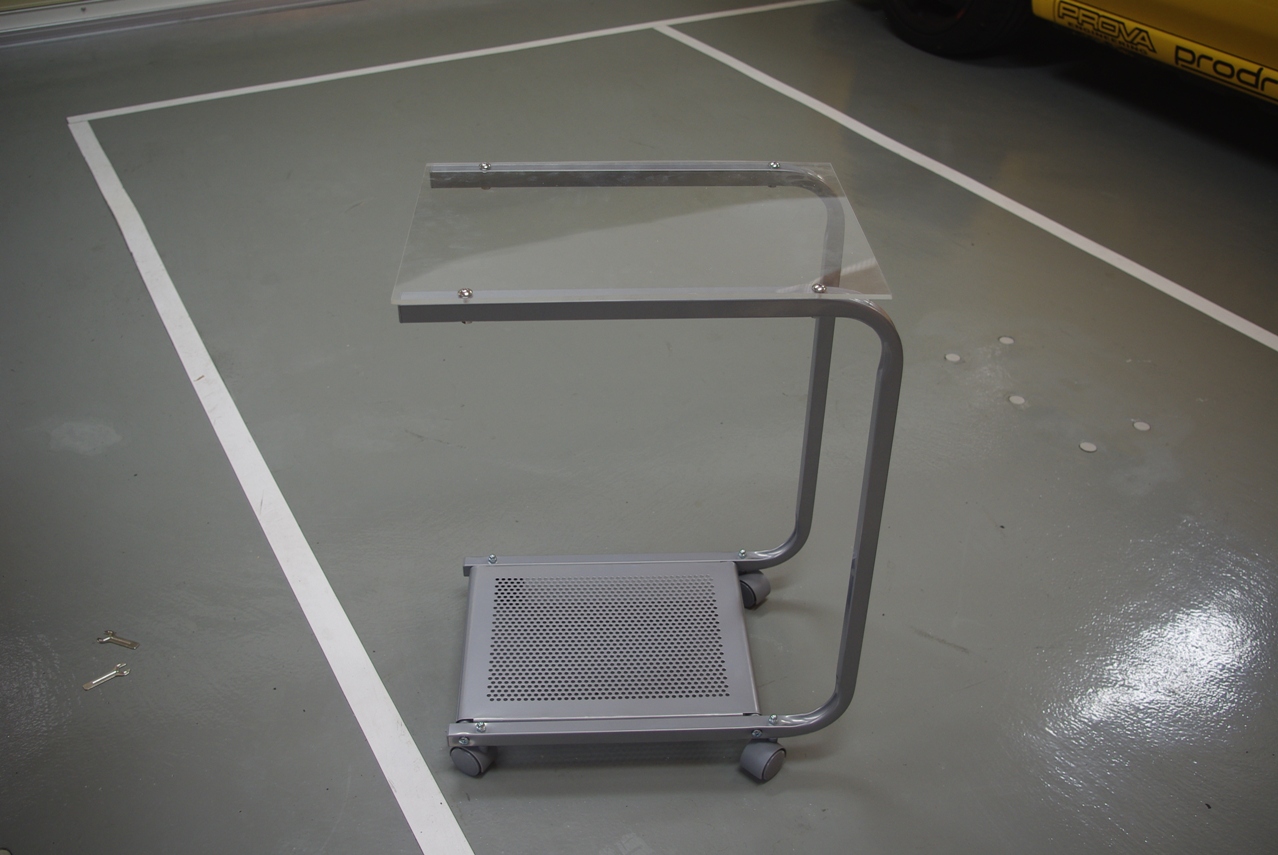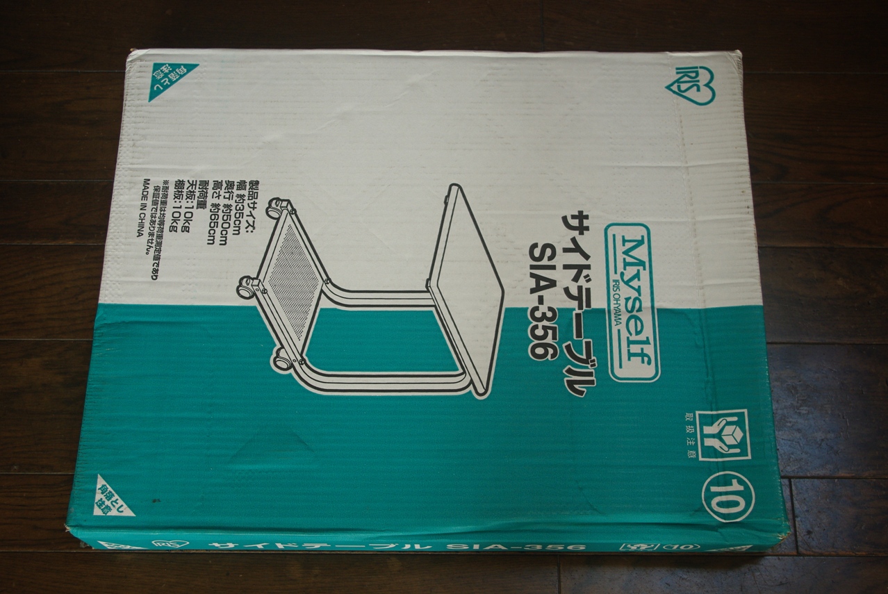 とりあえず壁際の作業台の上に置いているのですが、やはり作業台の上に常時置いておくのは邪魔になるので、専用の置き台として壁際に棚のようなものを作り付けることも考えてみましたが、移動することを前提にしたかったので、市販のサイドテーブルに適当な物がないか探しました。