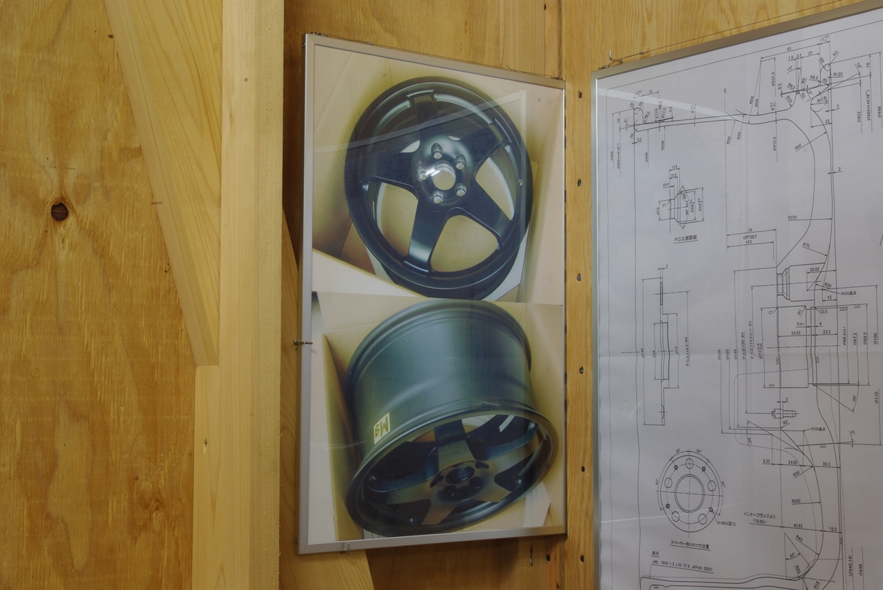 NEEZ鍛造マグネシウムワンピースホイールSEKの原寸大図面の隣に、出来上がってきたばかりのホイールの写真を2枚パネルにして飾っています。