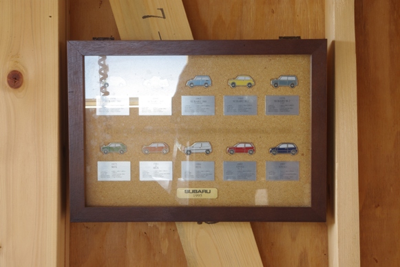 SUBARU歴代の軽乗用車のピンズが、年代順に解説のプレート付きで並んでいます。