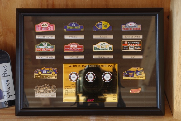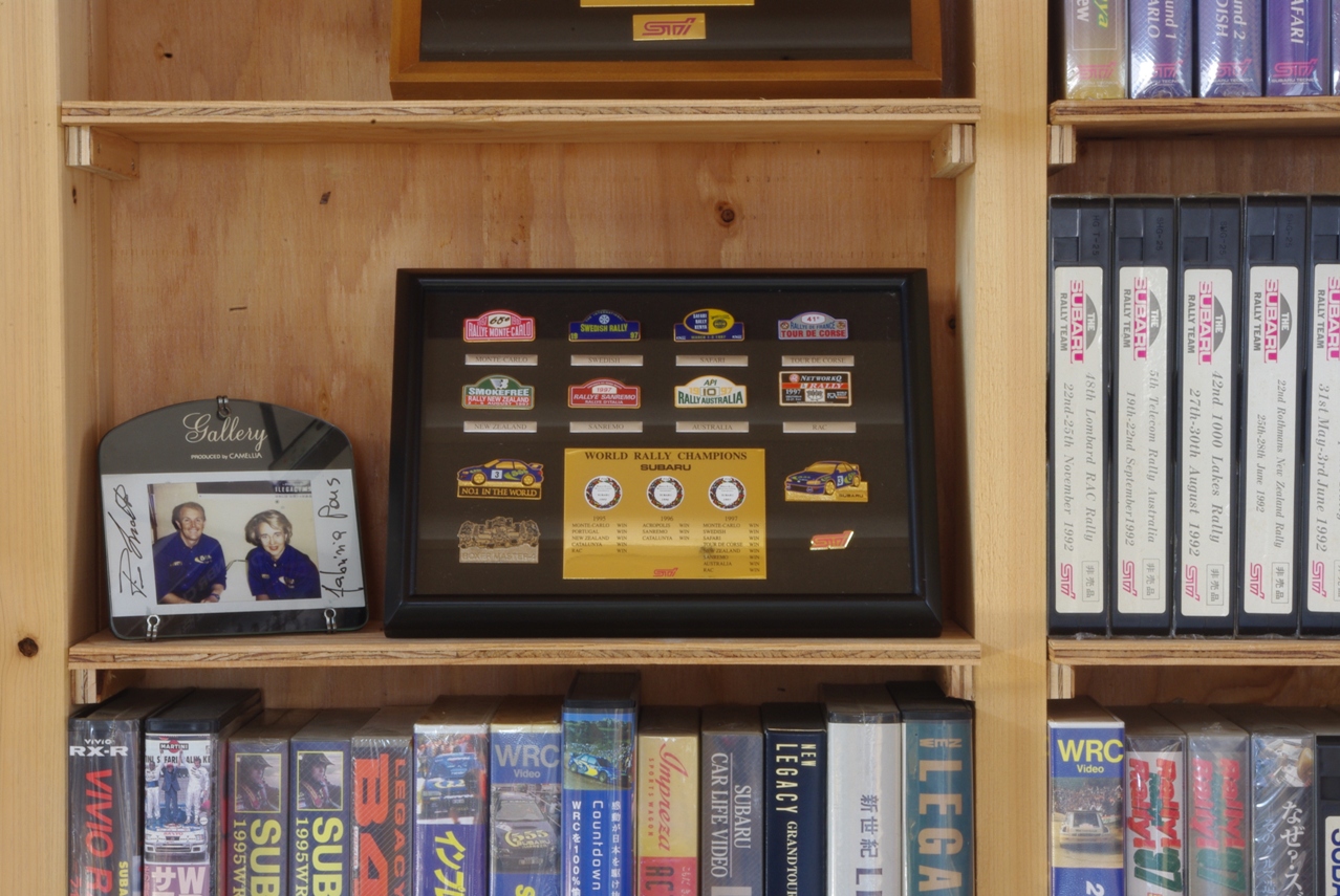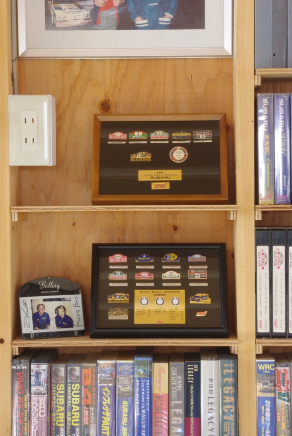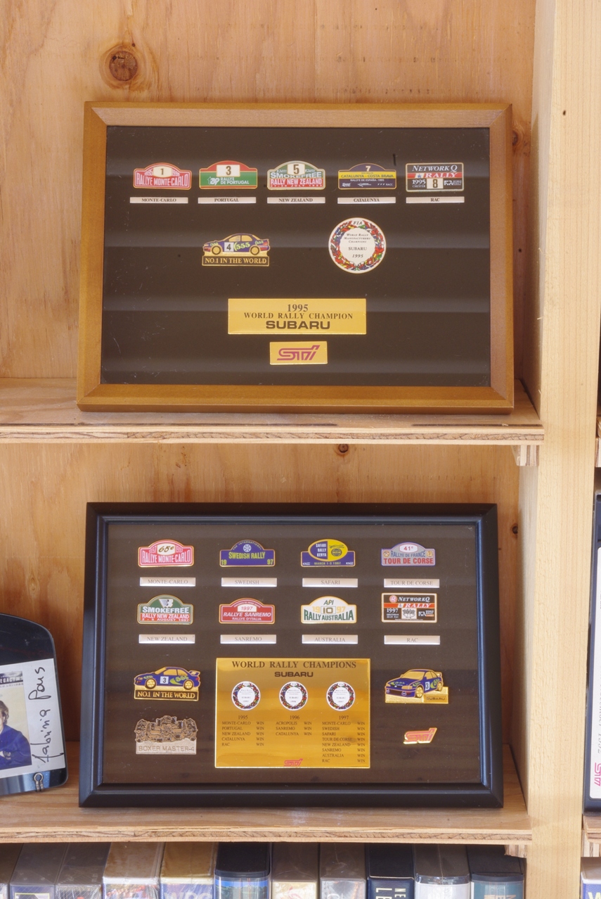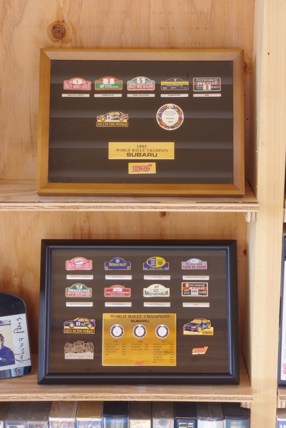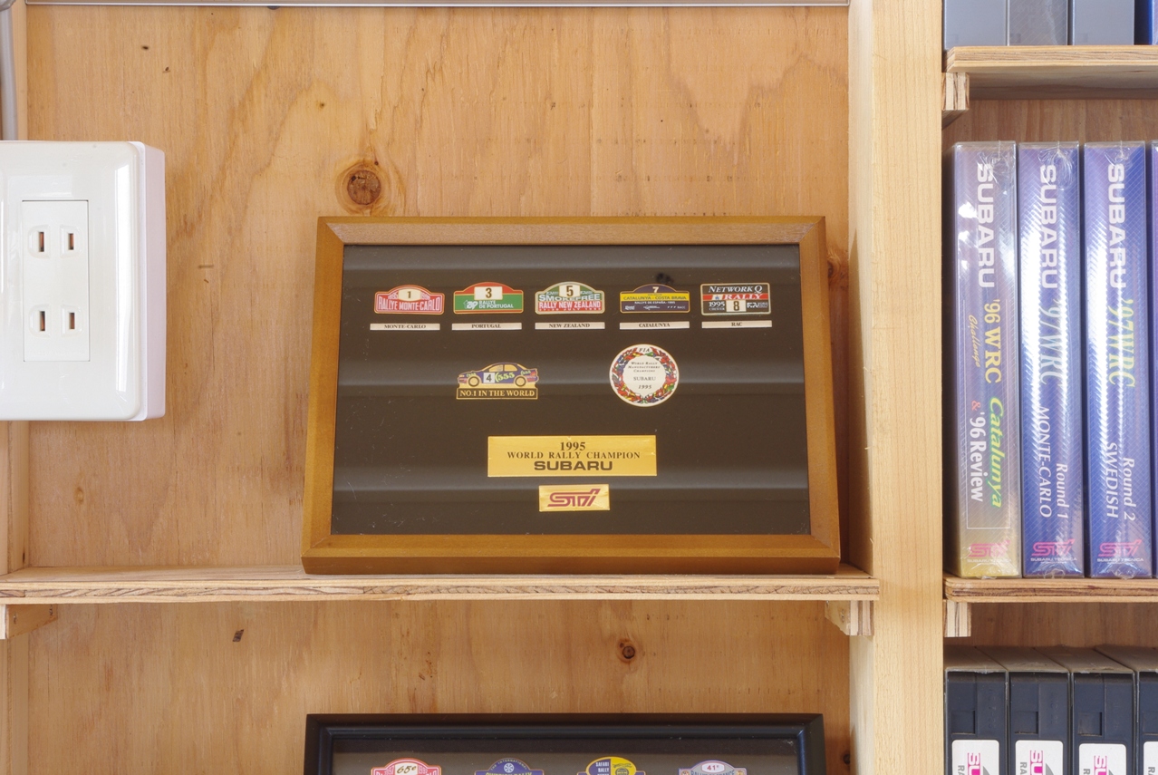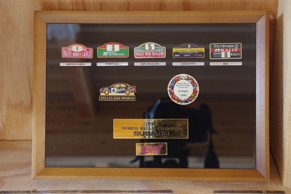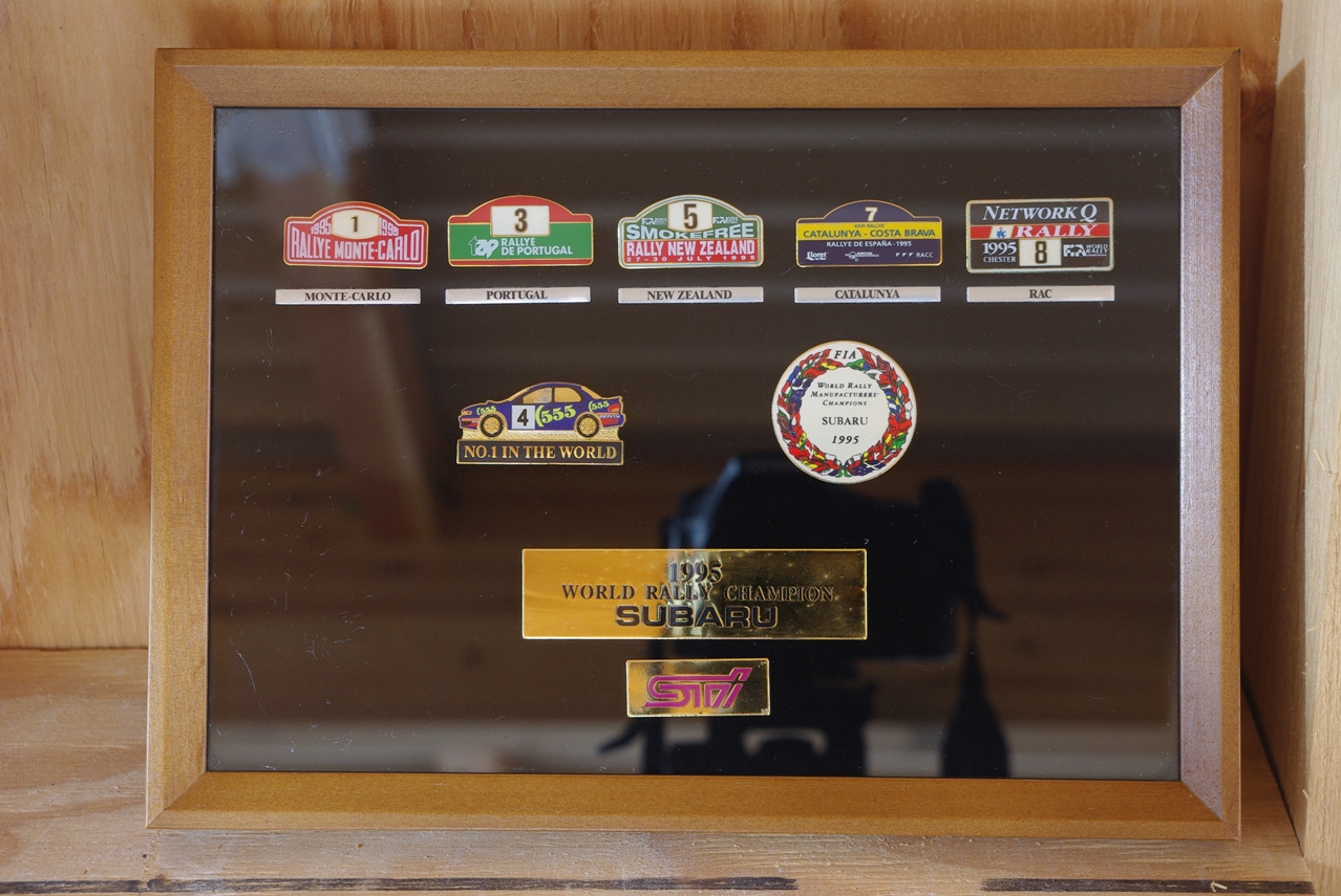ご存じSUBARUが1995年に、初のWRC世界ラリー選手権のメイクスチャンピオンとドライバーズチャンピオン(コリン・マクレー)のダブルタイトルを受賞したときの記念のピンズを収めた楯です。
