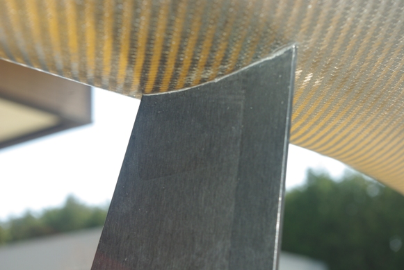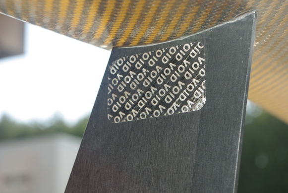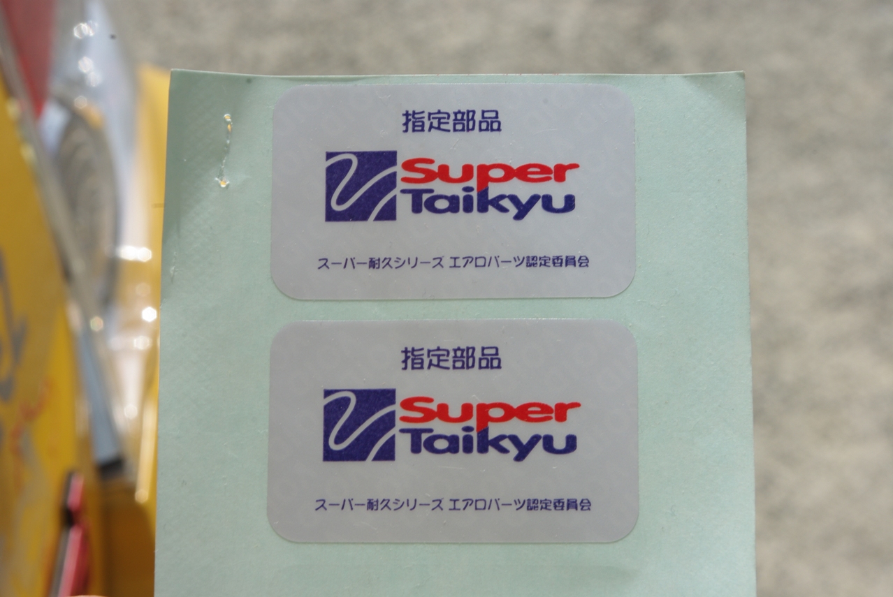 それは2008年8月9日にこのドライカーボン製リアウィングを装着していただいた際に、右ステーの内側上部に貼った、この「S耐エアロパーツ認定委員会」指定部品の証明シールが、ご覧の通りプリントされた文字が経年劣化で薄くなってしまったので、新品のシールに貼り替えていただくことでした。