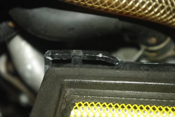 ブローバイガスホースの新品交換を実施したこの日、シリンダーヘッド右バンクのホースを外すために、エアクリーナーケースのアッパーケースを取り外した時、このようにアッパーケースの爪を引っ掛けるためのロアーケースのポケット部分が欠けていることに気がつきました。
