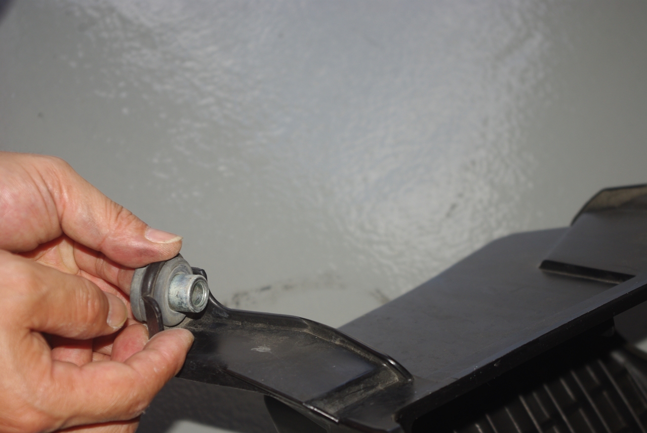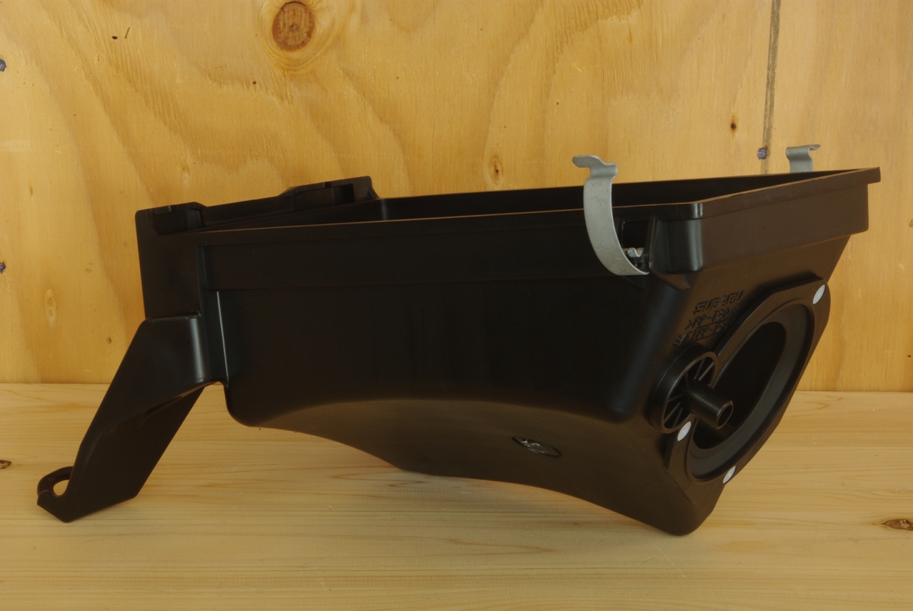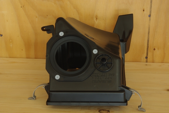 エンジンルーム壁側のレゾネーターの出口をロアーケースのエアーインテーク穴に差し込み、同時に壁のグロメットの穴にケース側の突起も差し込んで、ロアーケースの位置決めをした後、ボルトで2箇所、床部にケースの脚をしっかりと固定します。