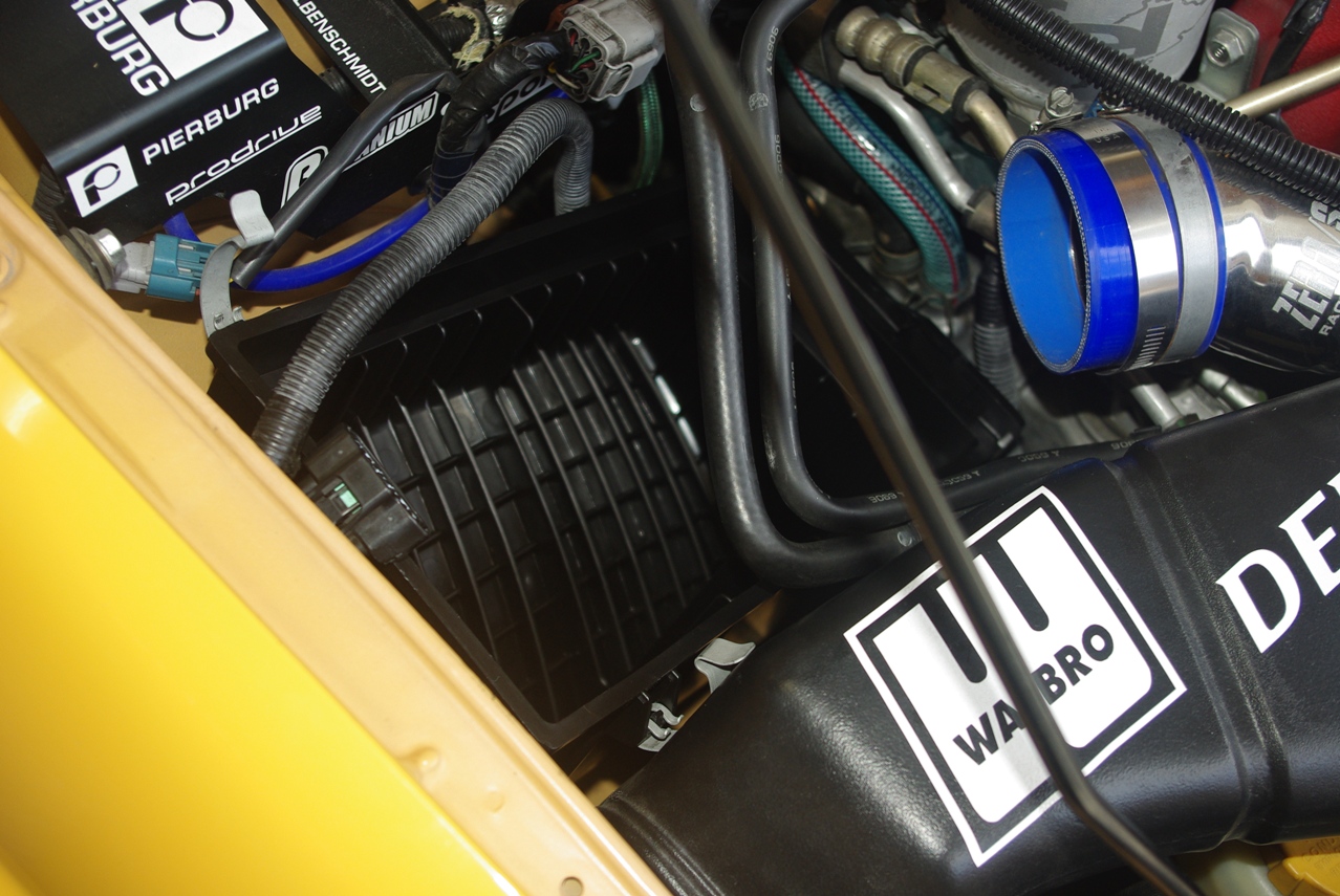 エンジンルーム右側、隔壁から突きだしているレゾネーターの出口が収まるエアーインテークの穴と、隔壁のグロメットに差し込んでケース本体を固定するための突起が見えます。