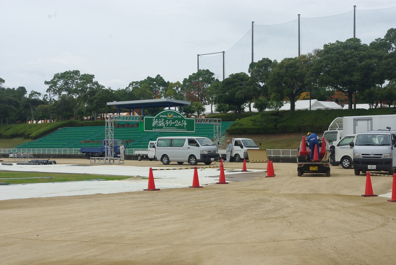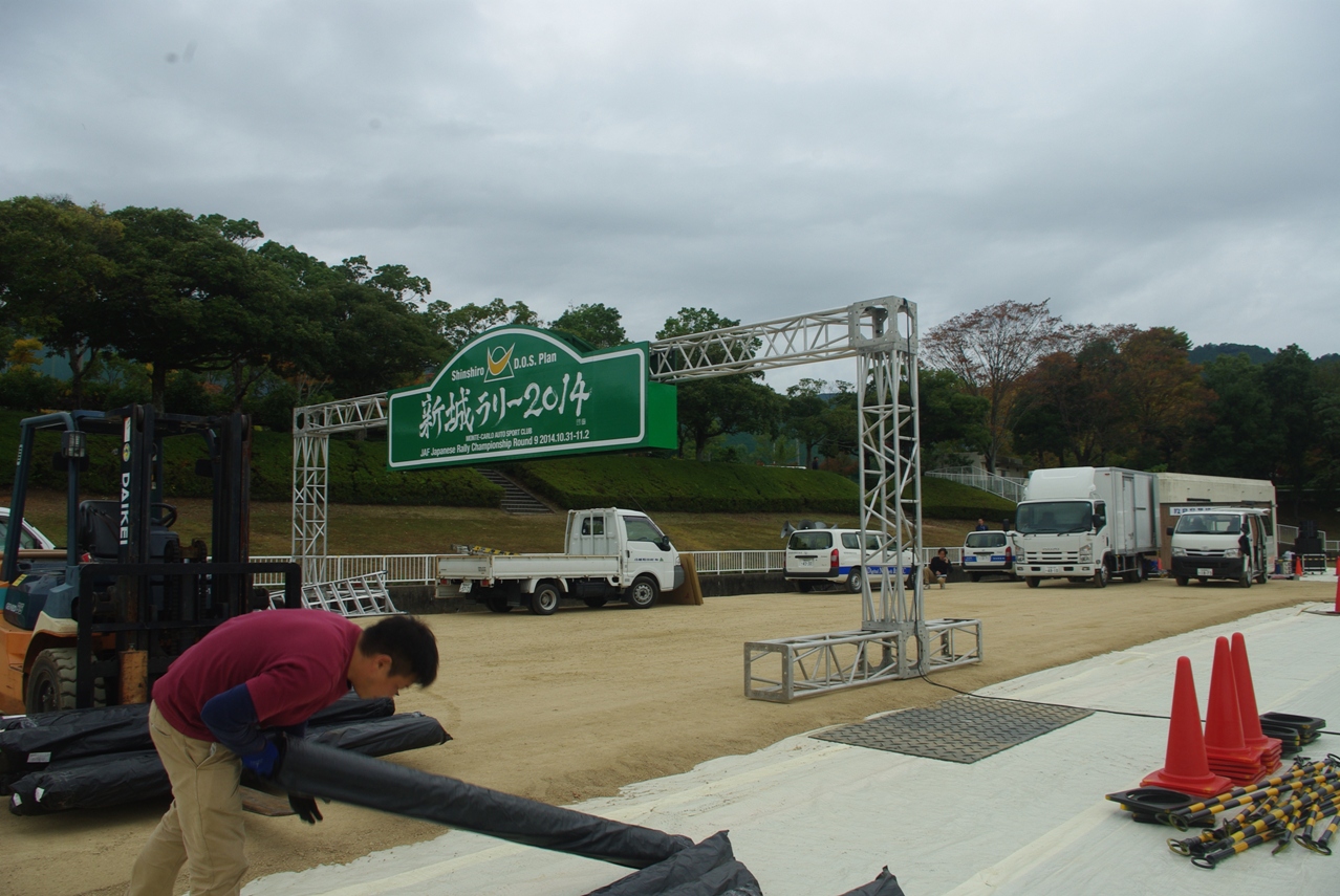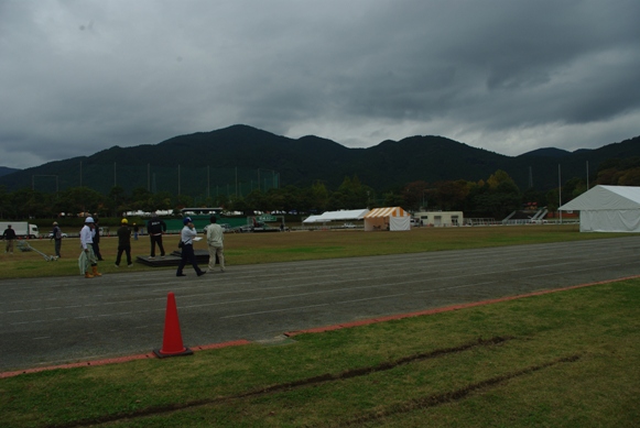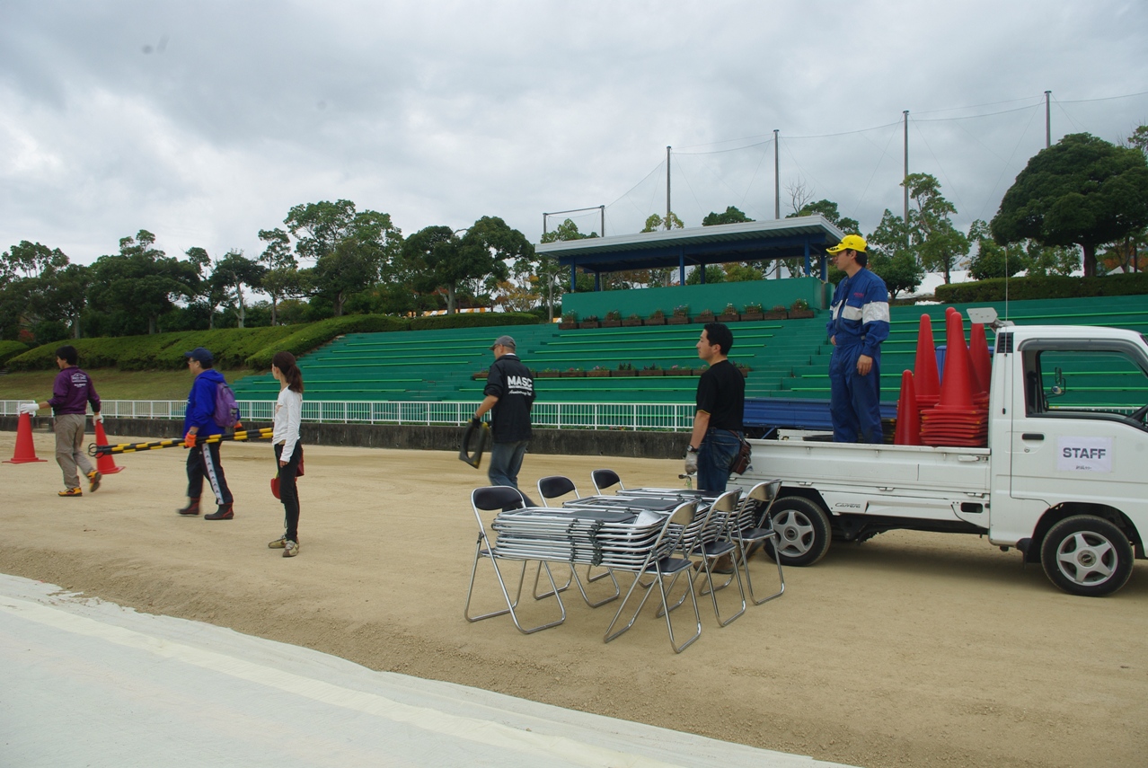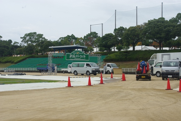 この会場は普段は陸上競技場ですが、サッカーゴールを移動したり、単管バリケードを設置したり、メーカーやチームの横断幕などを柵に取り付けたりと、いつもながらの作業がつづきます。