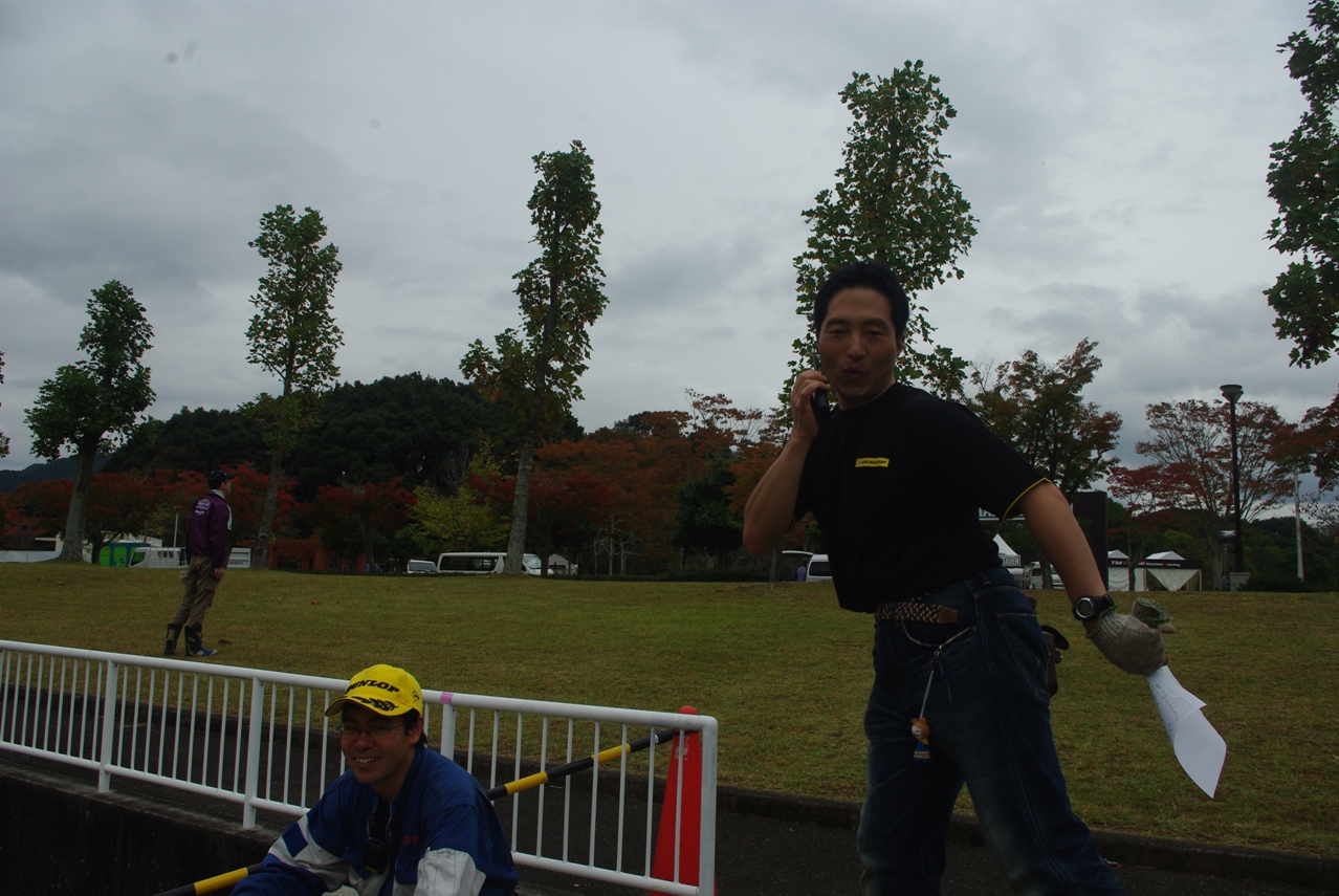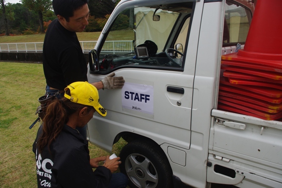 今回も雨が心配されますので、オフィシャルの作業車両に貼るスタッフラベルも、このように防水の為にテープを全面に貼り込んでました。