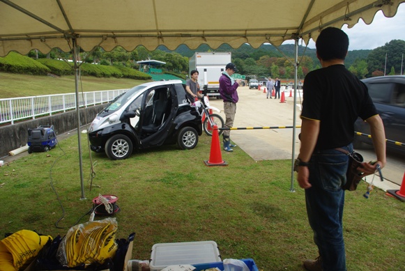 大岡オヤブンがこの広い会場を移動する足として、昨年までのセグウェイに代わって、この超小型EVカー「コムス」が活躍していました。
