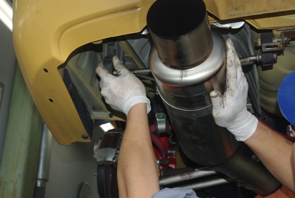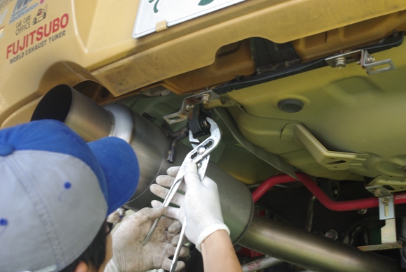 余分なデフ・オイルを排出している間(オイルが硬いので時間が掛かる)に、マフラーを取り付けることにしました。