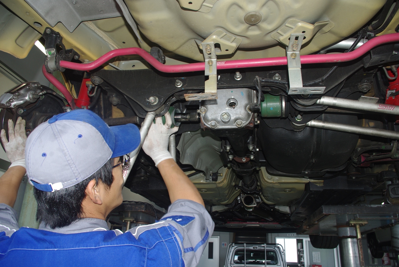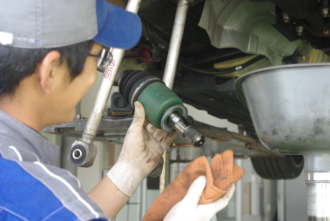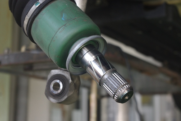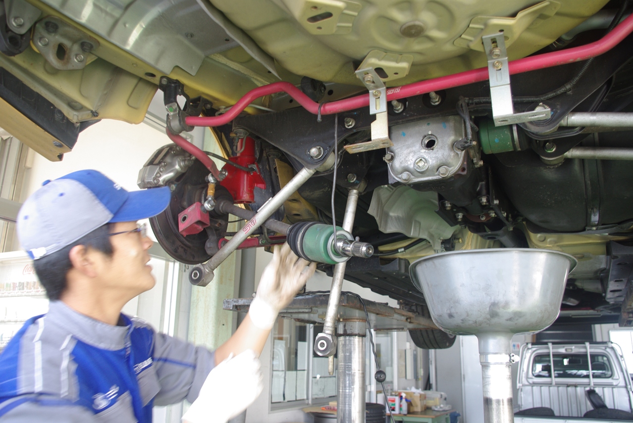 ドラシャの一方が固定されたまま、もう片方を下にしてぶら下げてしまうと、固定されている側の等速ジョイントにムリな力が掛かってしまうので、このような配慮が必要になるわけです。