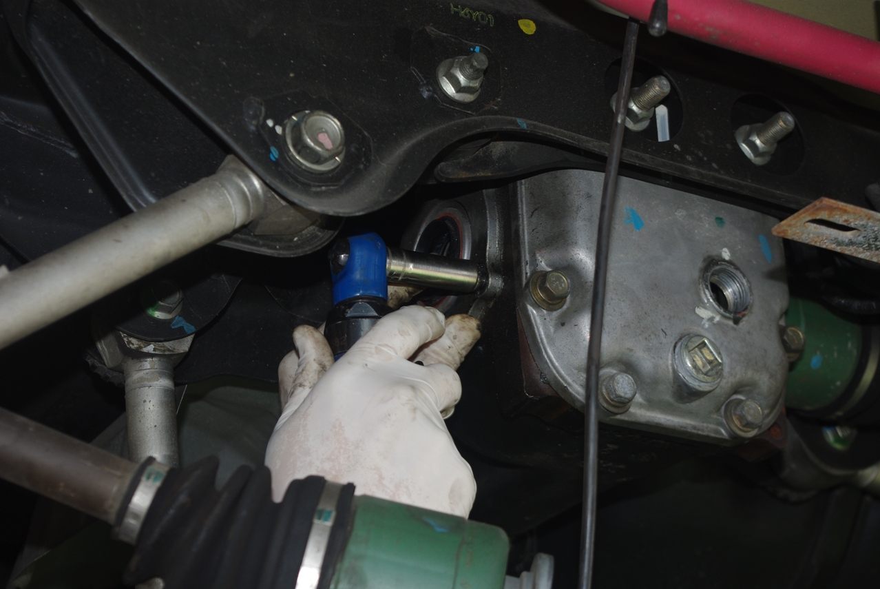次に左リアのドライブシャフトをデフから抜き取りました。