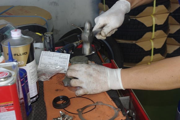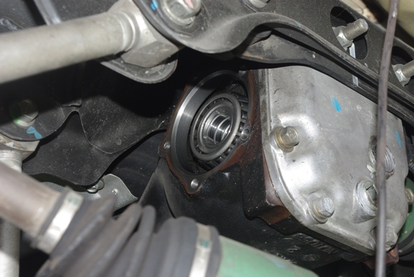 続いて、ドライブシャフトを丁寧にディファレンシャルケースに差し込みます。