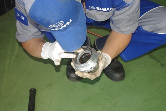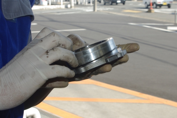 ホルダを内側から見て、ベアリングが真っ直ぐ正常に嵌まっているか確認しています。