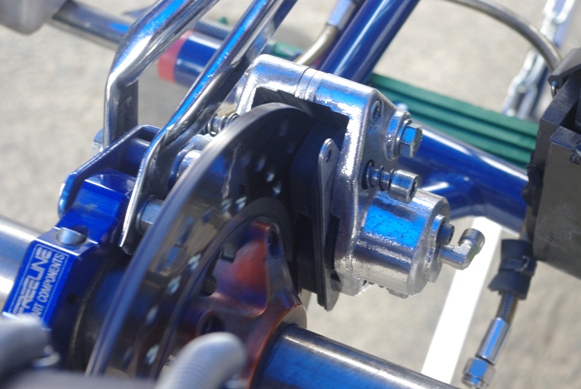 スグさまテントにカートを持ち帰って、ブレーキ本体付近をチェックすると、ブレーキディスク付近の後輪のシャフトに、漏れ出たブレーキ液が付着していました。