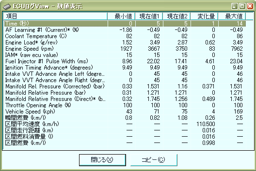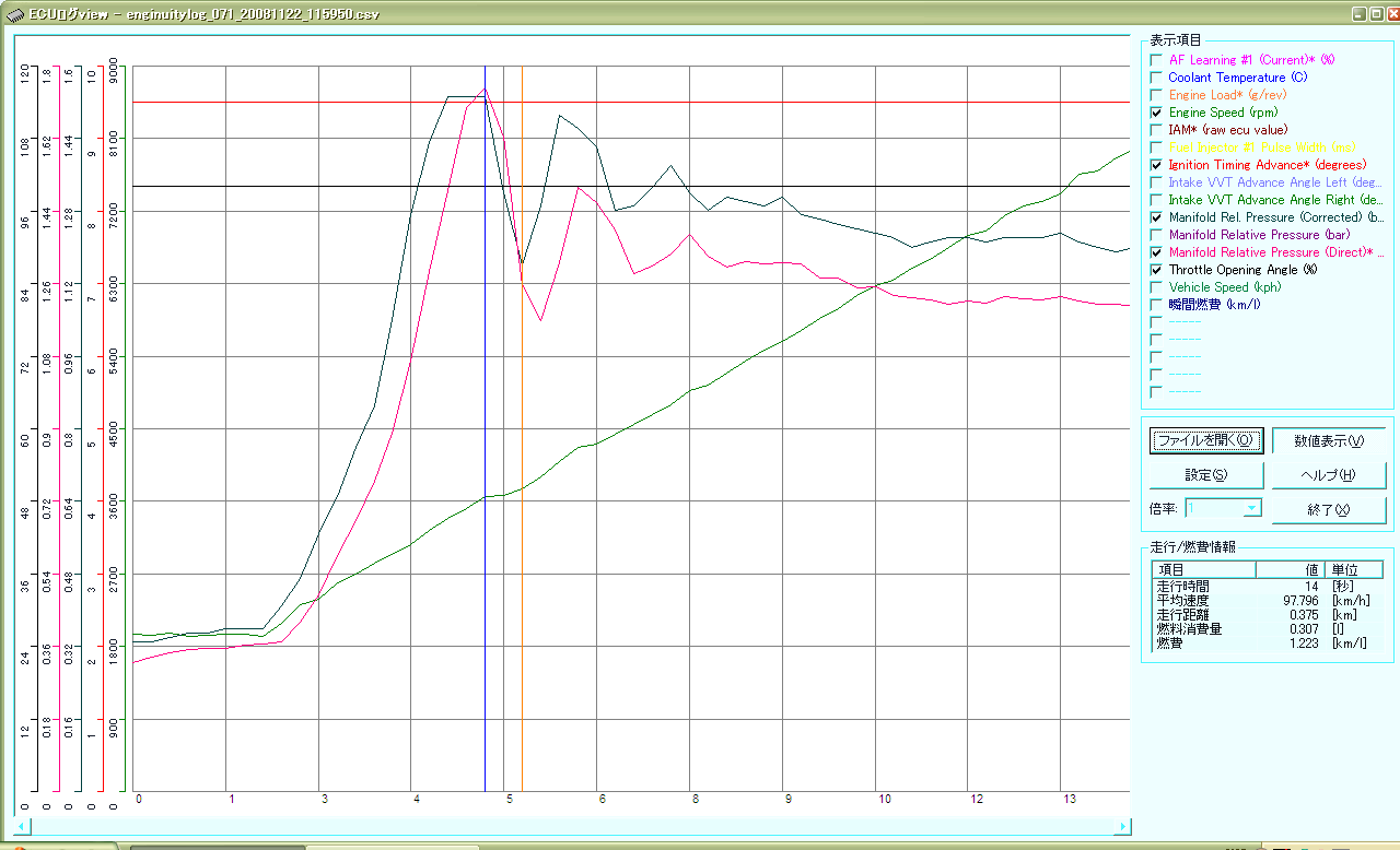 また、運転中のエンジンDATA LOGGINGについては、純正ECU書換編集ソフトEnginuityのECU logger機能を使用し、記録保存を実行しました。さらに、保存したDATAの再現はグラフ化ソフトのECUlogviewで行っています。
