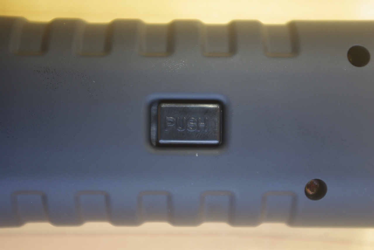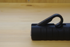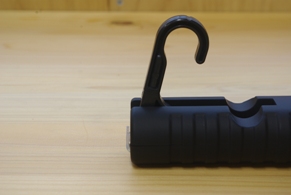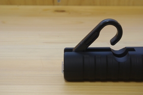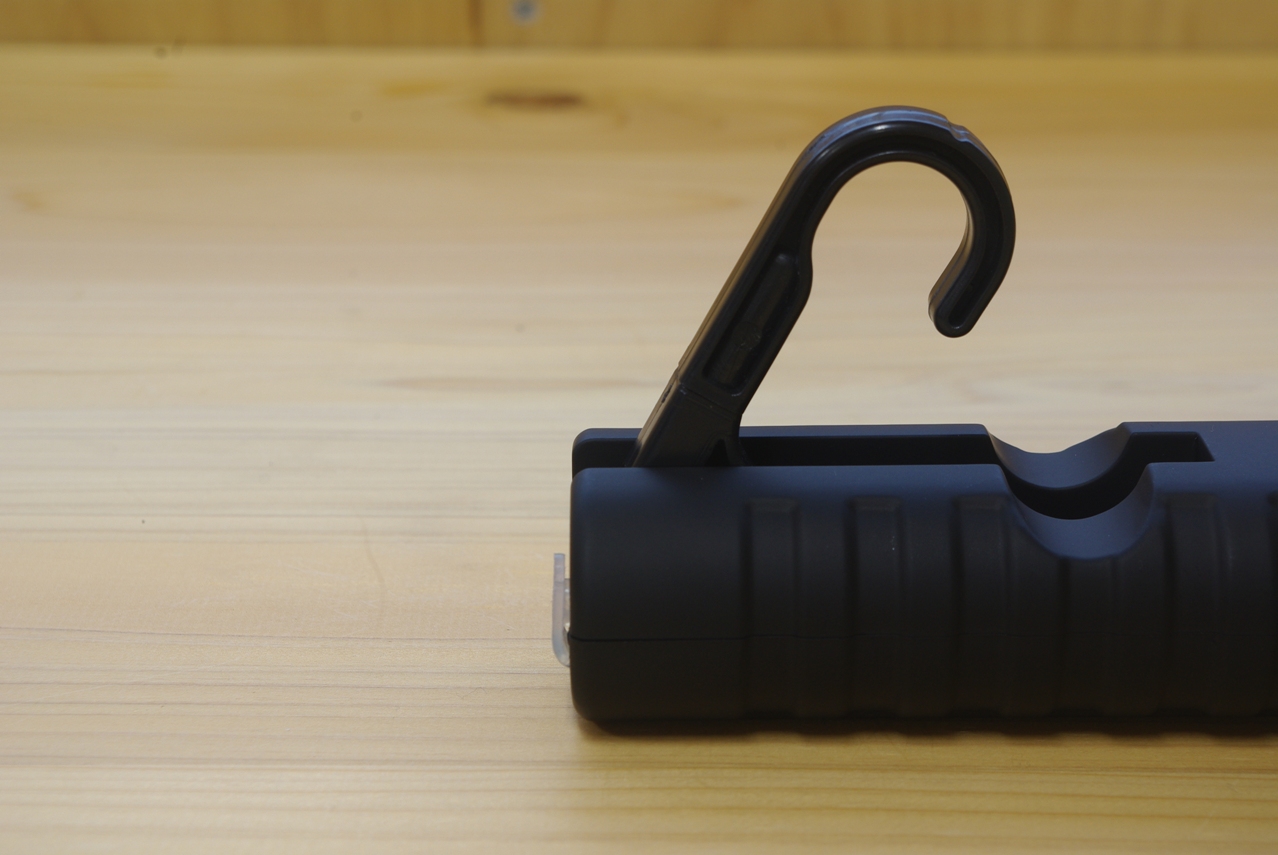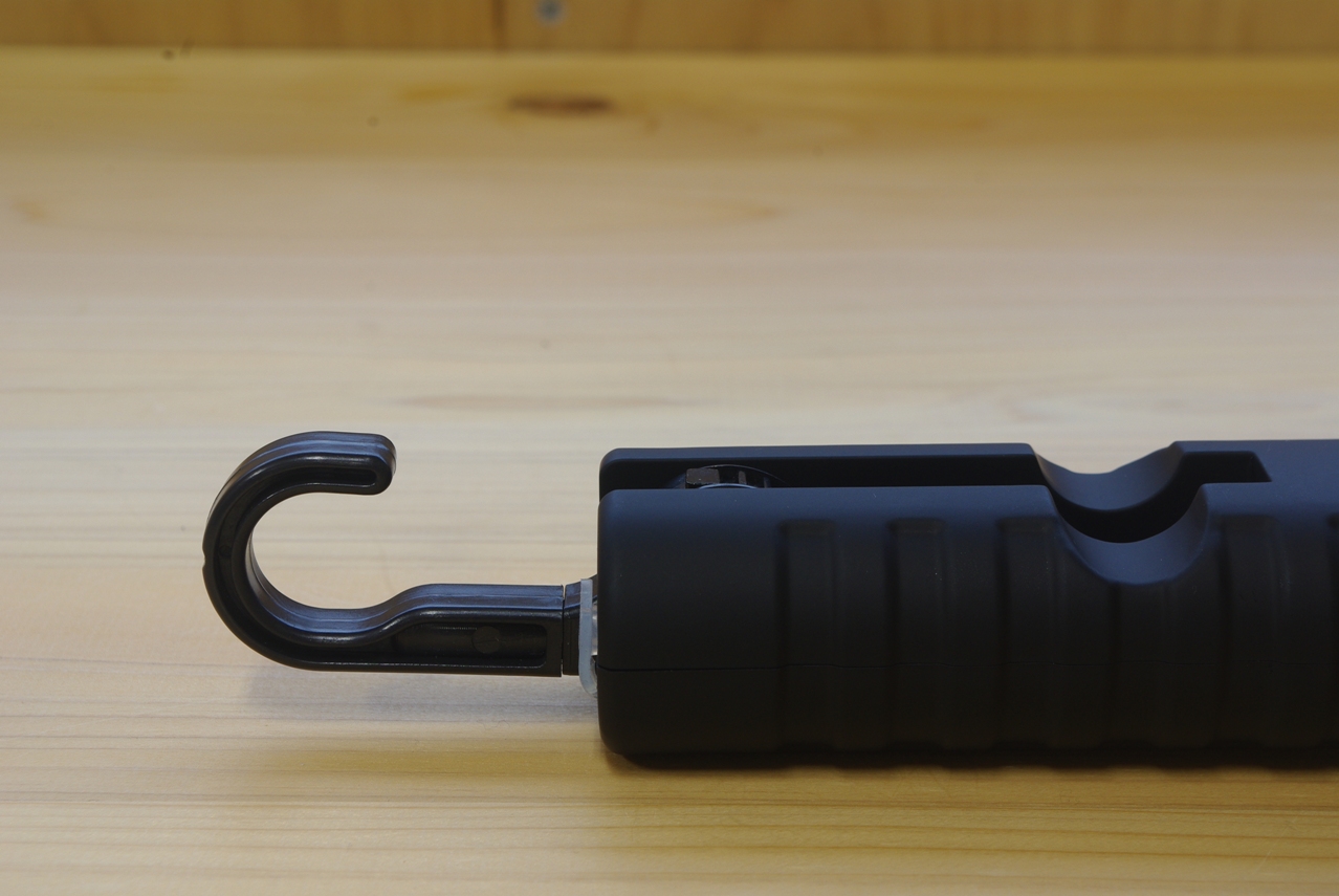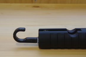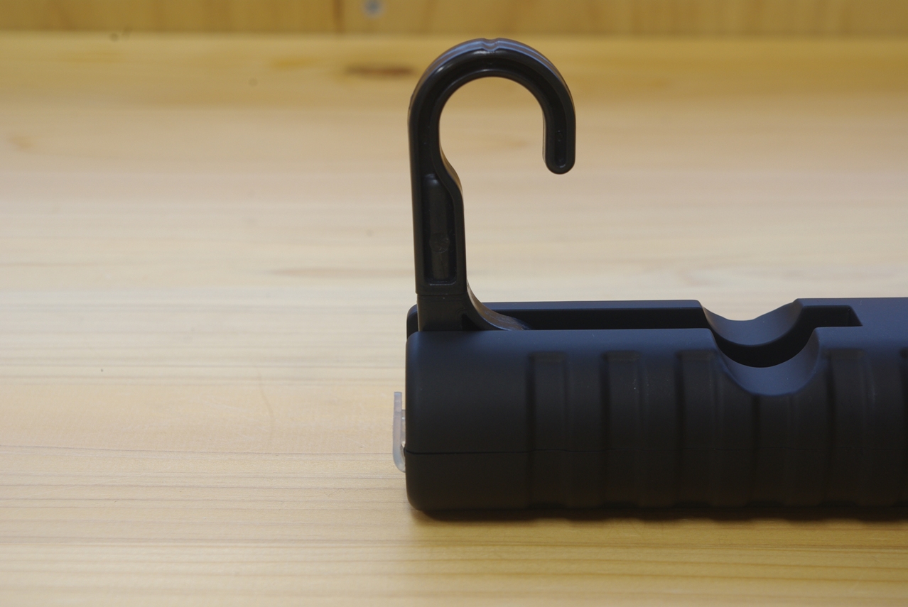 フックは引き出し角度を固定するノッチ式になっていて、ノッチをリリースするためのボタンが本体背面、フック部格納位置の裏側あたりに付いています。