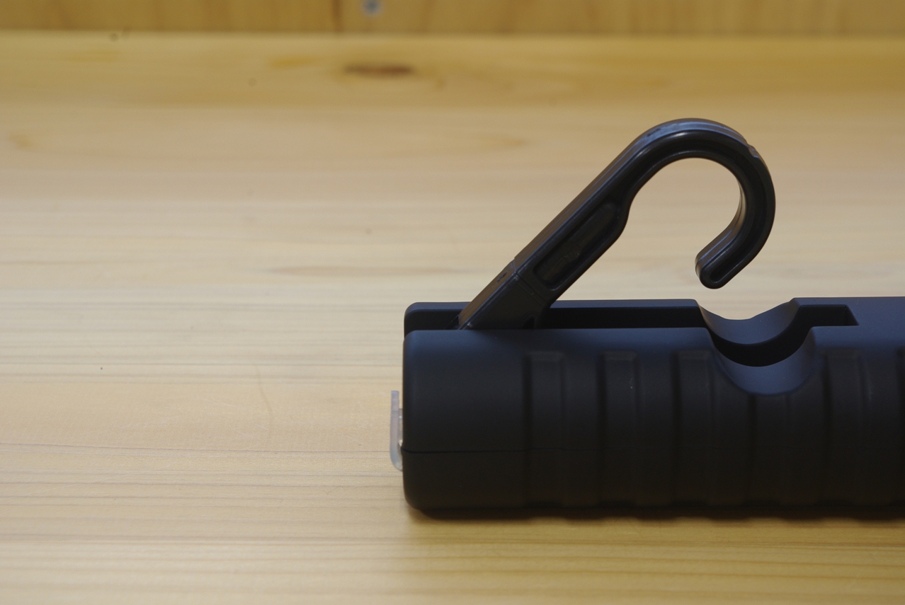 また、フックのステー部が360°回転可能で、固定ノッチが格納位置とそこから180°回転位置2箇所に設けてあり、それ以外は引っ張った状態でのフリーです。