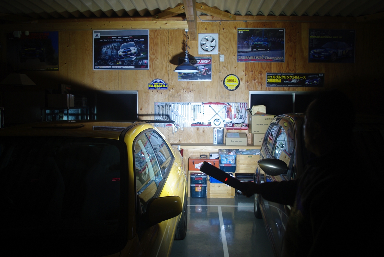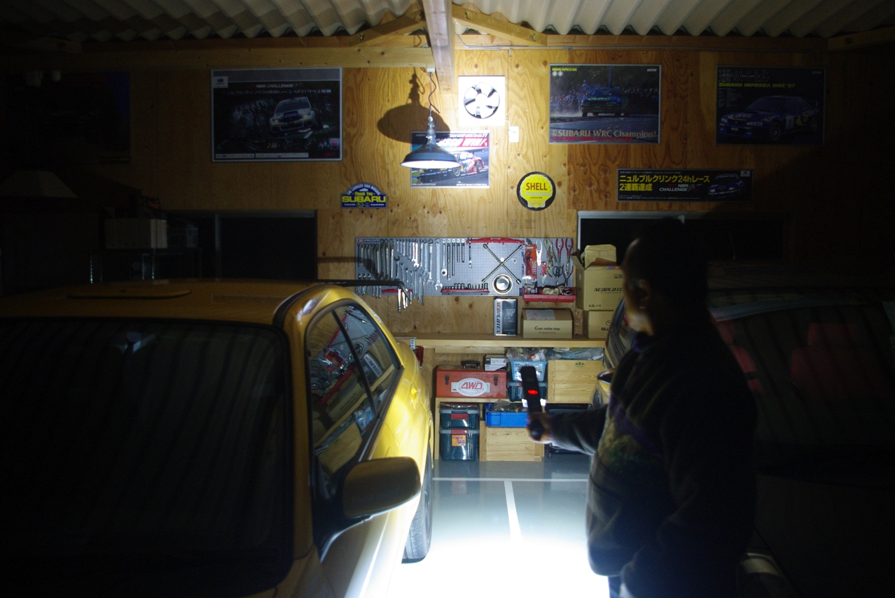 照射面の明るさ照射範囲をもっと判りやすくするために、ガレージの壁面に照射しました。