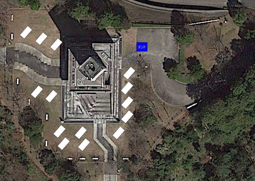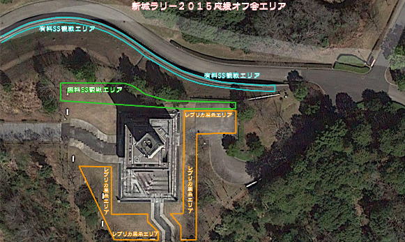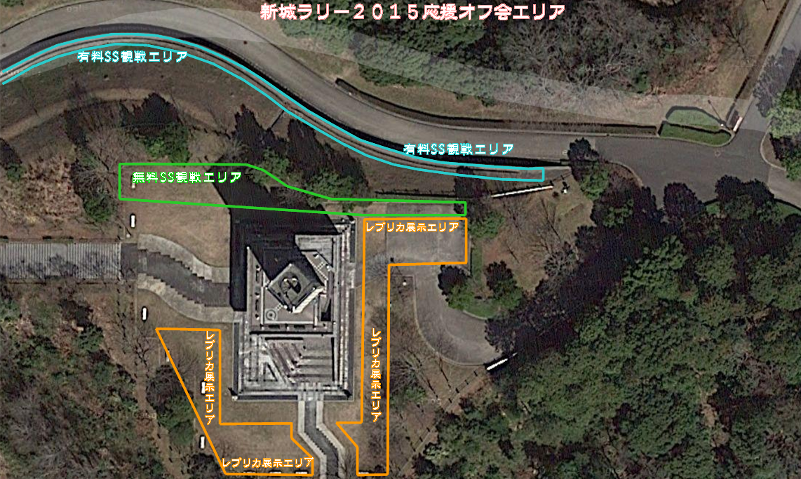 直後に大石さんの「新城ラリー2015応援オフ会」オフィシャルサイトにアップされたオフ会エリアを示す航空写真です。