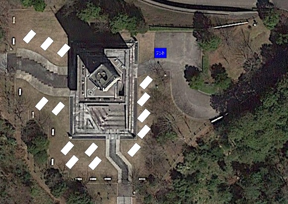下に見える木立の影の芝生のスペースあたりに、オフ会の本部テントを設営する予定です。