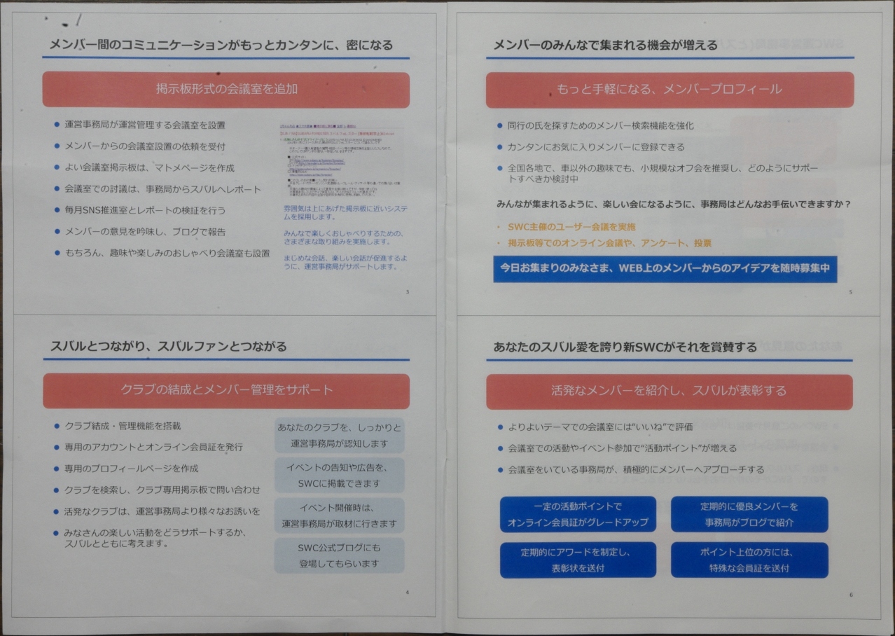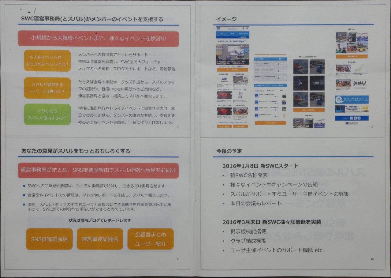 そこでメーカー側からは、冒頭のメール文でご紹介しました富士重工業株式会社 スバルネクストストーリー推進室 室長 小島 敦氏から、その辺りを鑑みて年明けからリニューアルする予定のSUBARU WEB COMMUNITY では、これまでとは異なり、もっと自由にユーザーイベントのサポートなどが可能になるように、メーカーとは違った立ち位置で独立性を前面に打ち出す考えであると、我々ユーザーにとっては誠に嬉しいお言葉をいただけました。