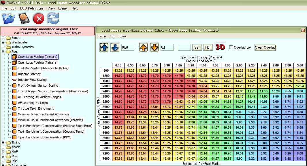 ECUの各項目ごとに、DATAマップを比較していく内に、Fuel項目のOpen Loop Fueling(Primary)マップの縦軸の一番上、エンジン回転数800回転で、横軸のエンジンロードが一番左0.1g/revから、0.3、0.5、0.7、0.9g/revと5つのセル内の数値で、ノーマルDATAと書換DATAの数値に著しい違いがあることを発見しました。