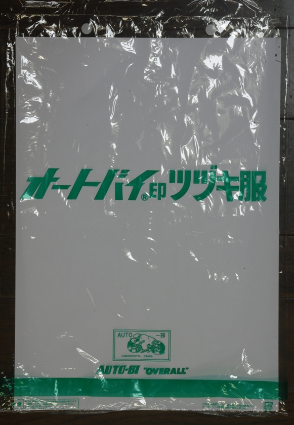 このツナギが入っていたビニール袋のパッケージにある、「オートバイ印ツヅキ服」というのが、いかにも昭和レトロな感じがしてイイですねー♪