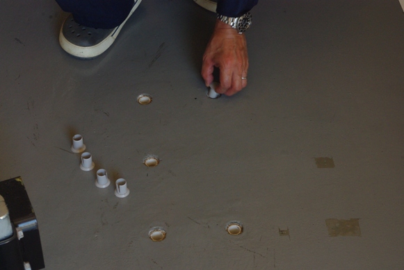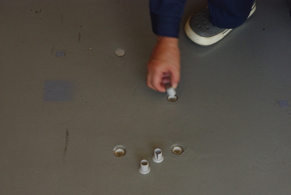 Maxjax Portable Lift の支柱台座を固定するために、床アンカーボルト穴のダストキャップを取り外します。