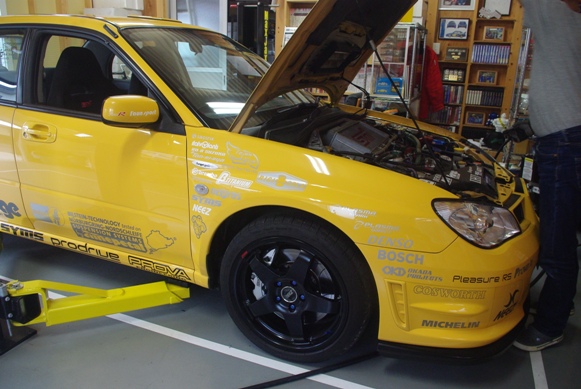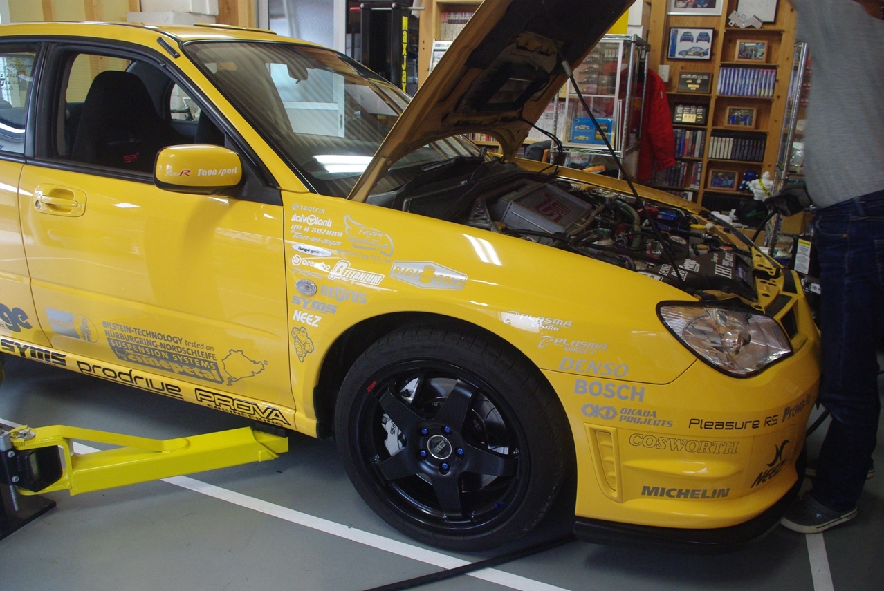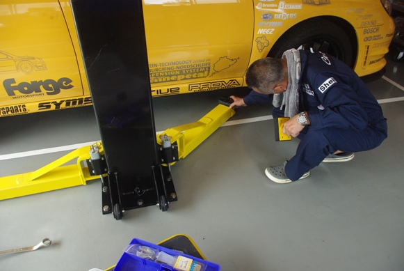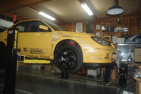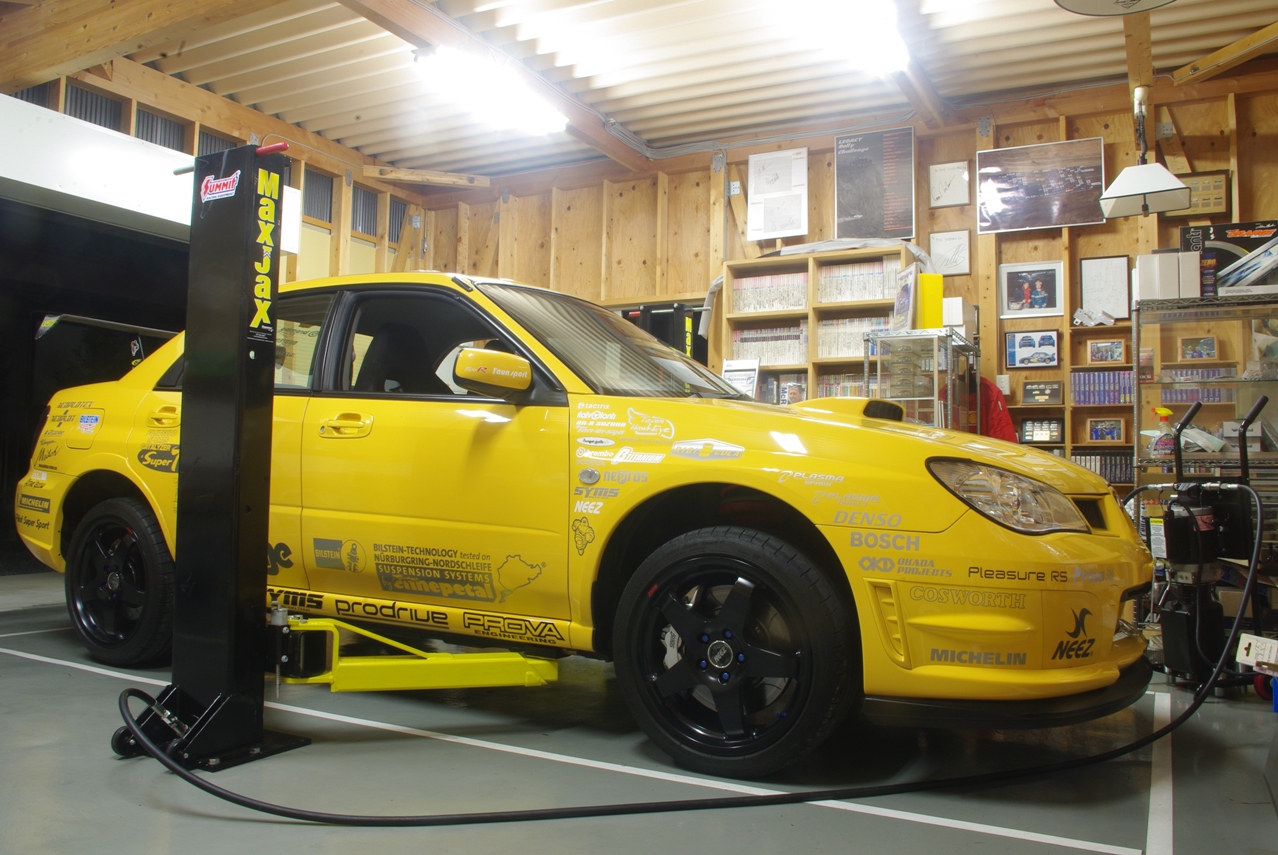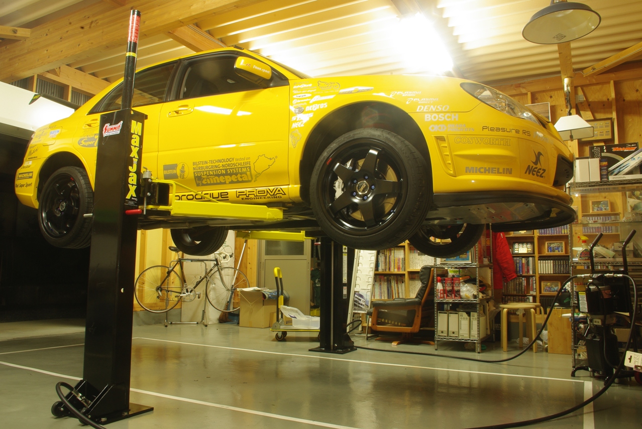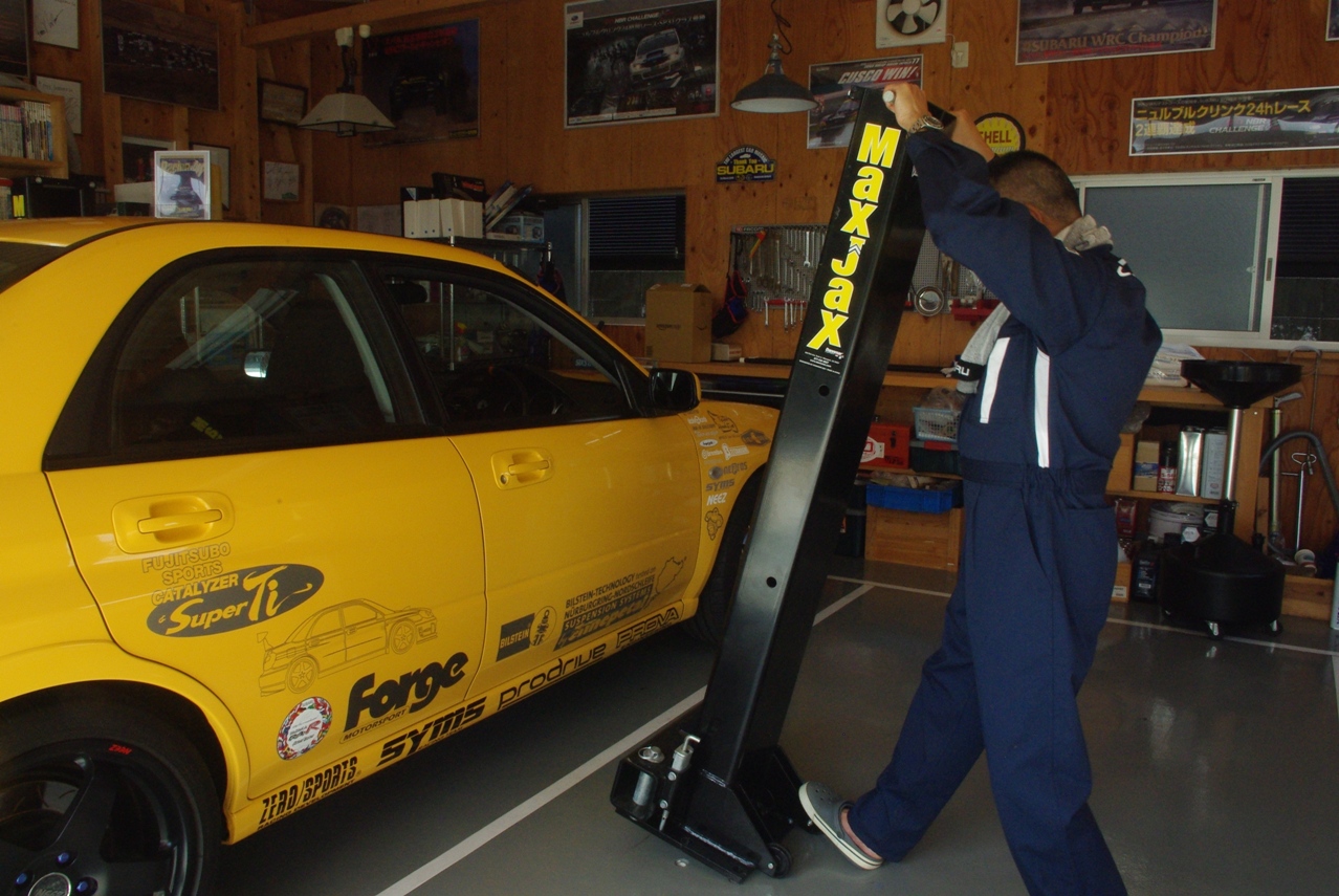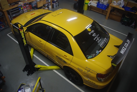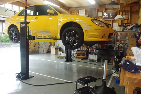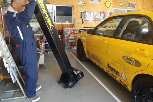 エンジンフードを閉めてからリフトアップします。(これを忘れると、天井の大梁にフードの先端が接触してしまいます)