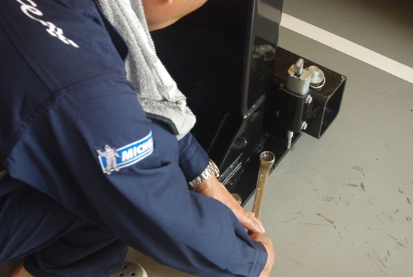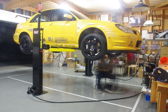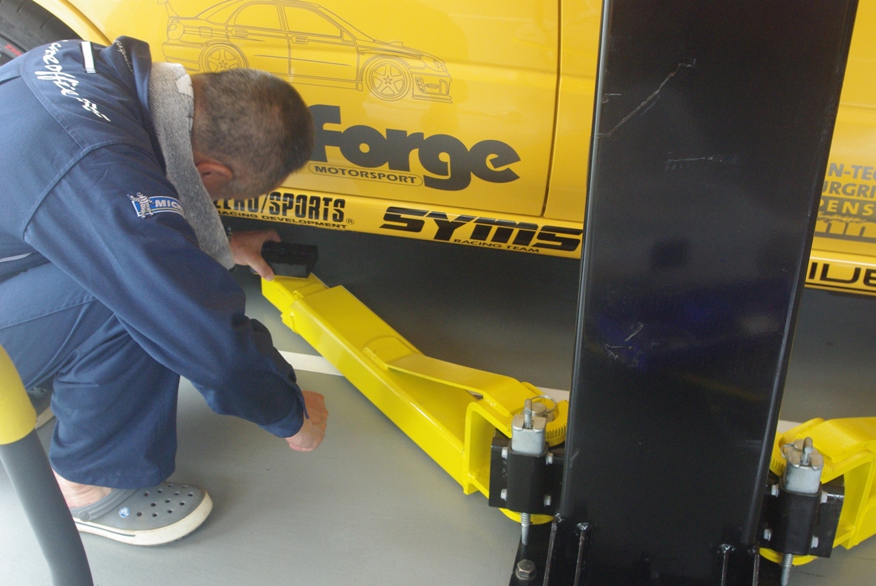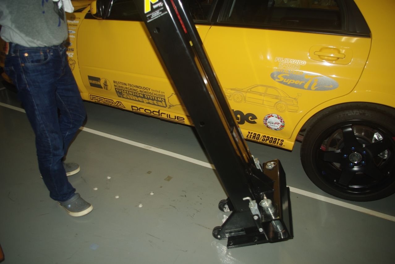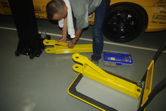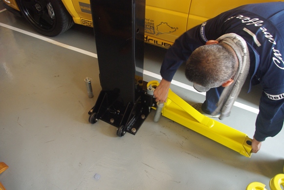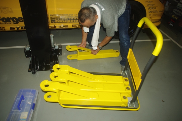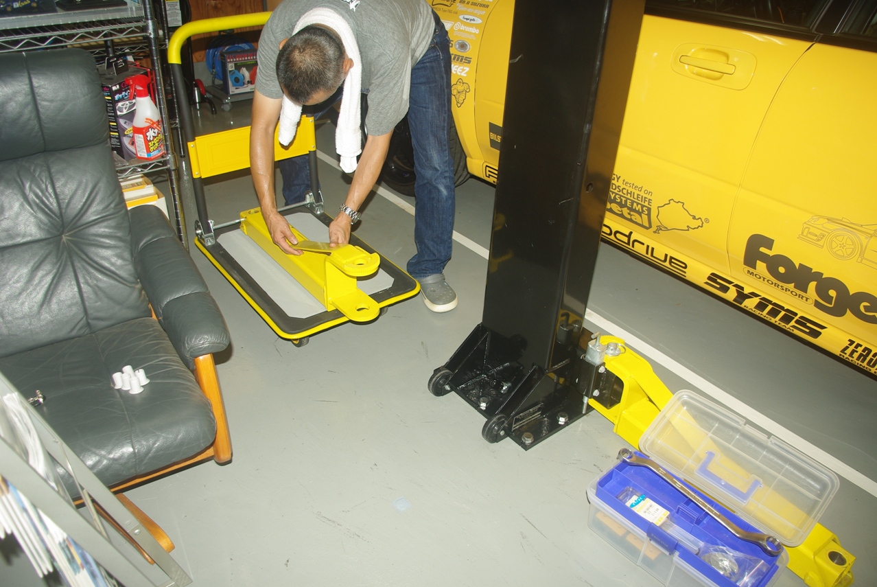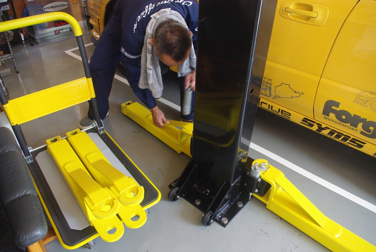 リフトアームを取り付けたら、アームの先端に受け台を取り付けて、車両のジャッキアップポイントの位置にアームを動かして合わせます。
