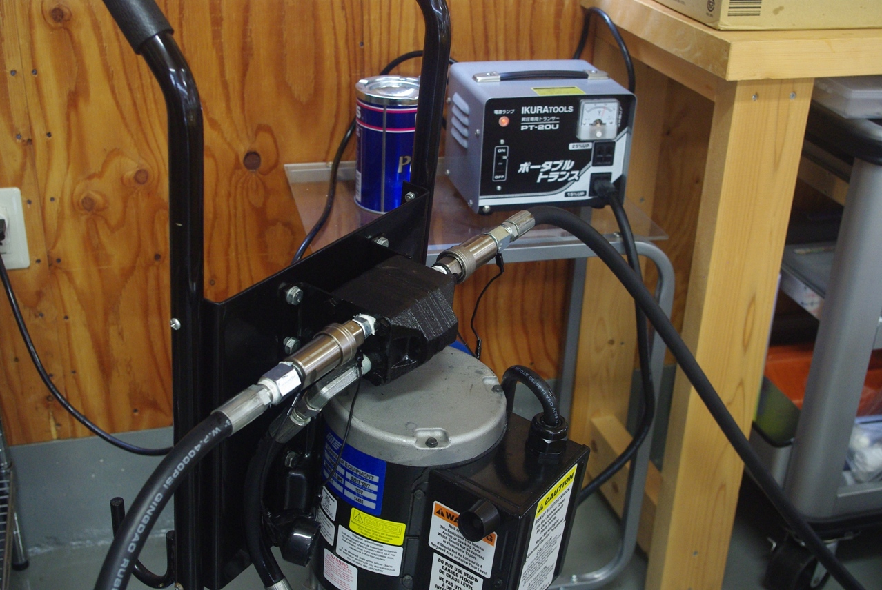 リフト本体の設置が完了したので、コントローラーのギアブロックに油圧ホースのカプラーソケットを接続します。