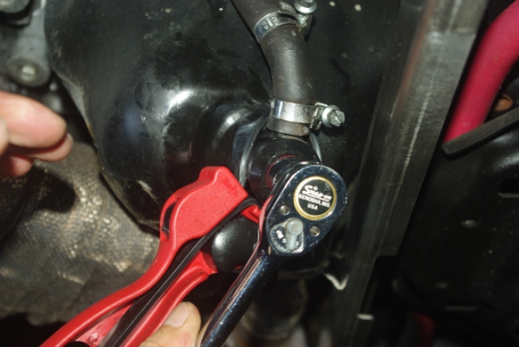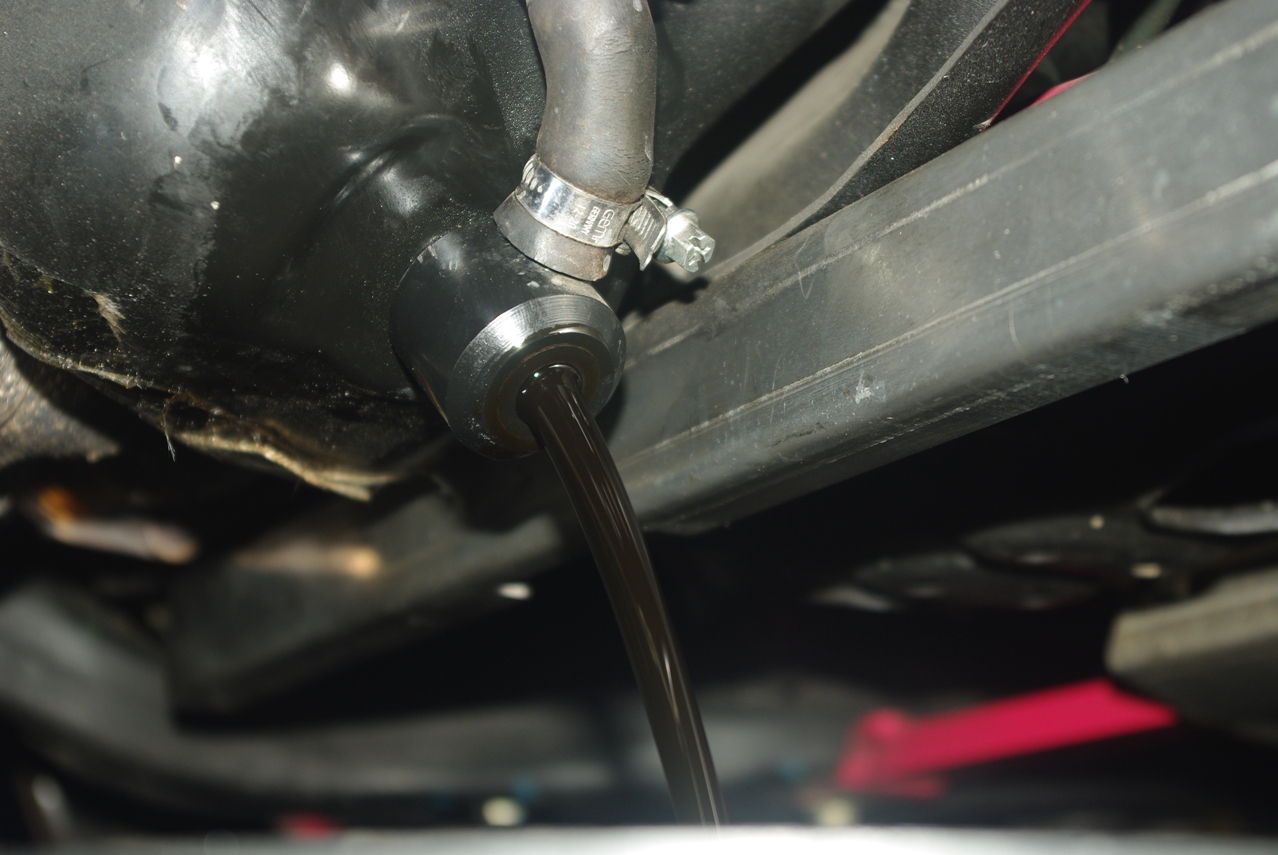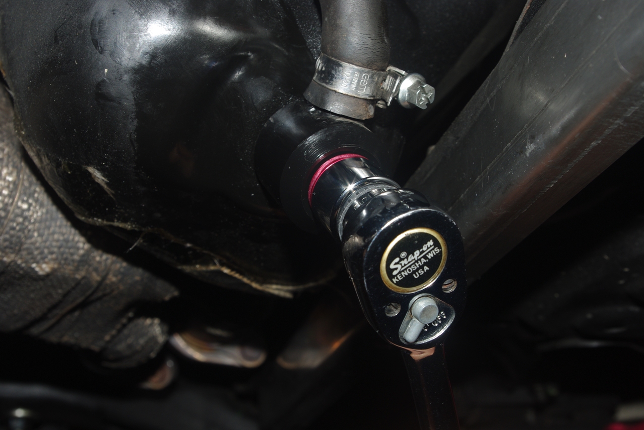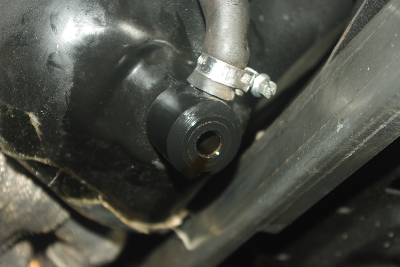 オイルミストセパレーターのリターンホースの接続アダプターが、ドレンプラグと一緒に回ってしまわないように、回り止めとして使用しています。