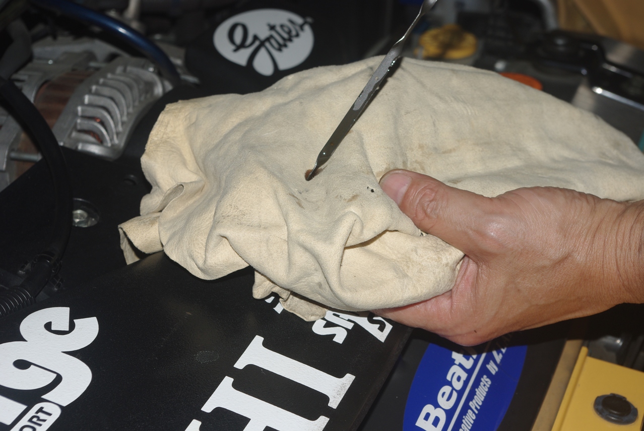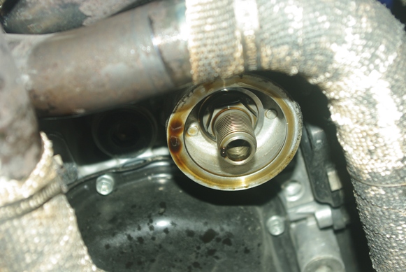エンジンオイルがほぼ完全に落ちきるのを待ってから、エレメント装着面等の汚れを丁寧に拭き取ります。