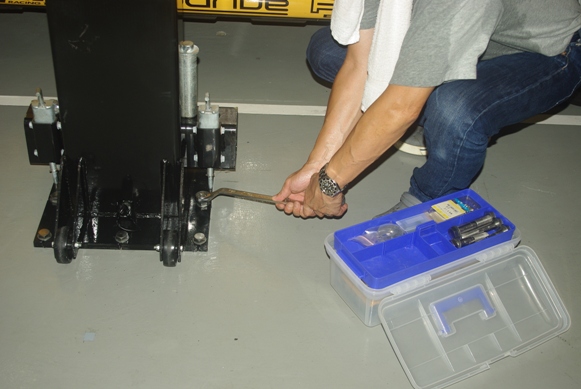 まずはじめに移動したリフトの支柱を、アンカーボルトで床にしっかり固定します。