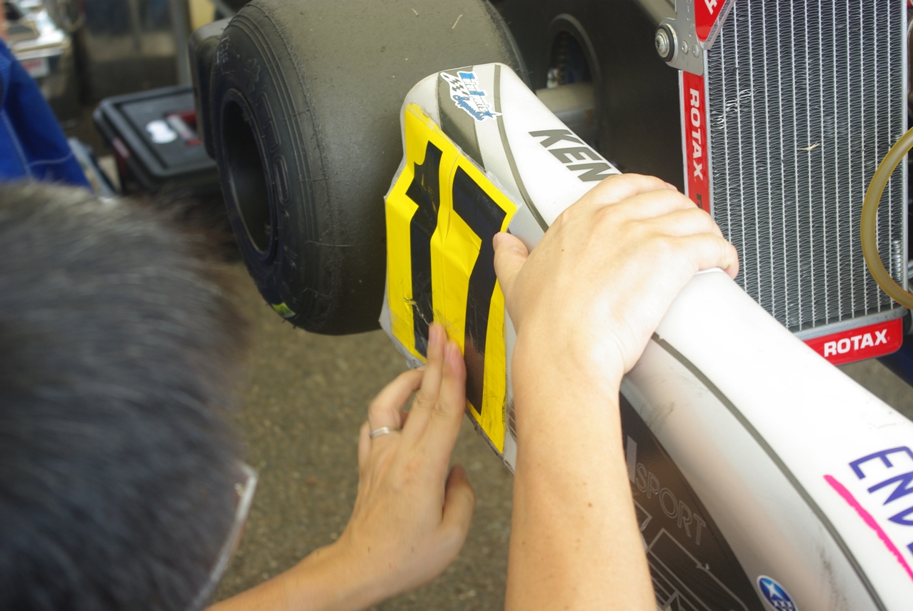 この画像は接触して一部破れて剥がれ、タイヤ痕で黒く汚れてしまったゼッケンを、クリーナーを使って綺麗に拭いています。