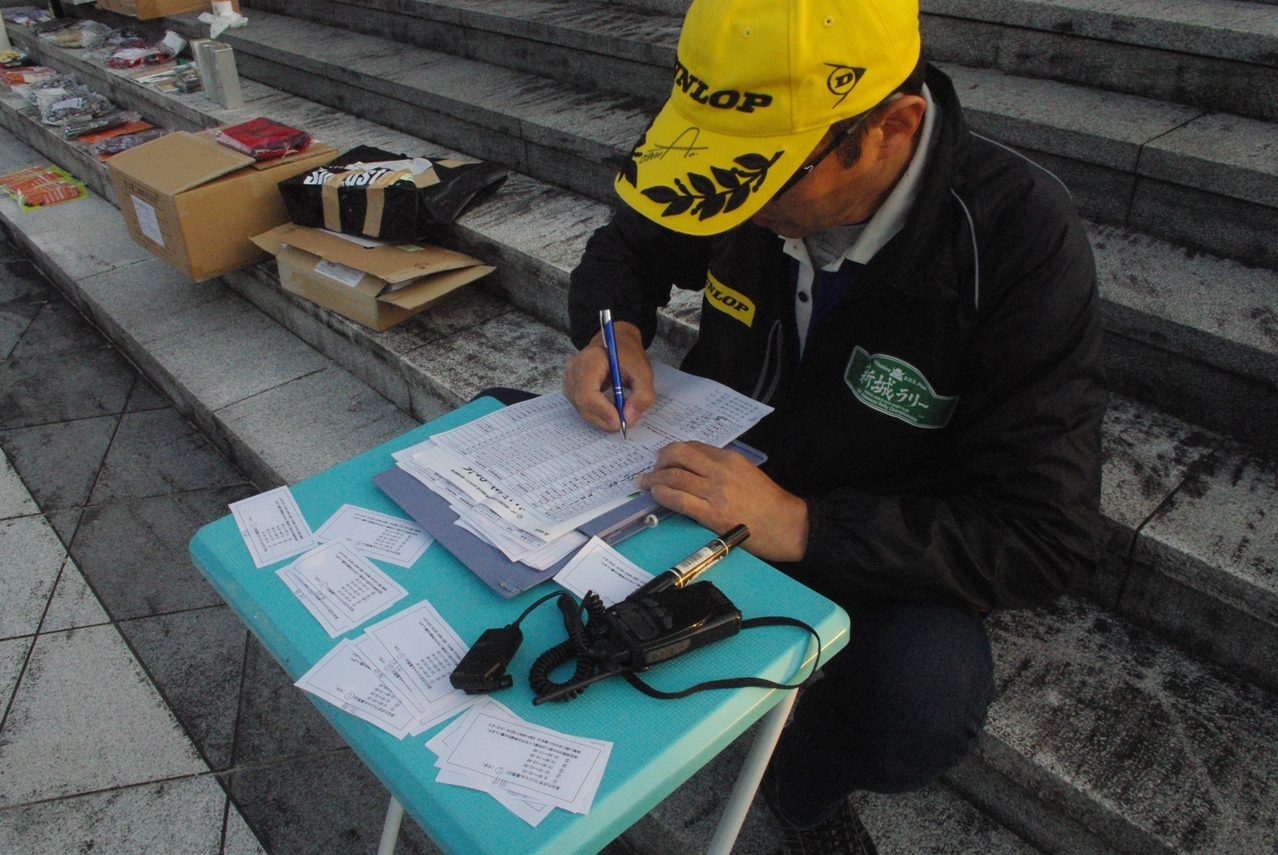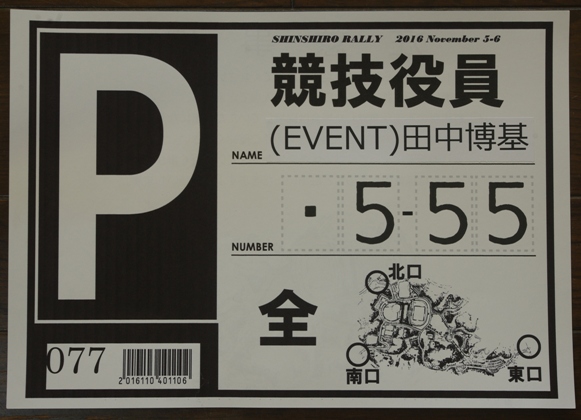 受付ではこうして、新城ラリー実行委員会から発行された車両証に、ご本人のお名前と、おクルマのナンバーを記入していただいてからお渡しています。