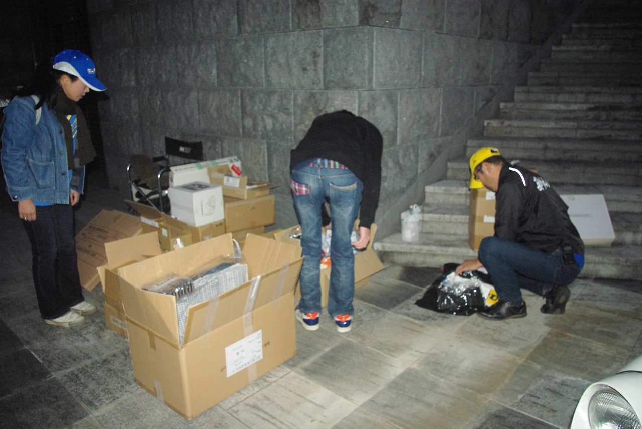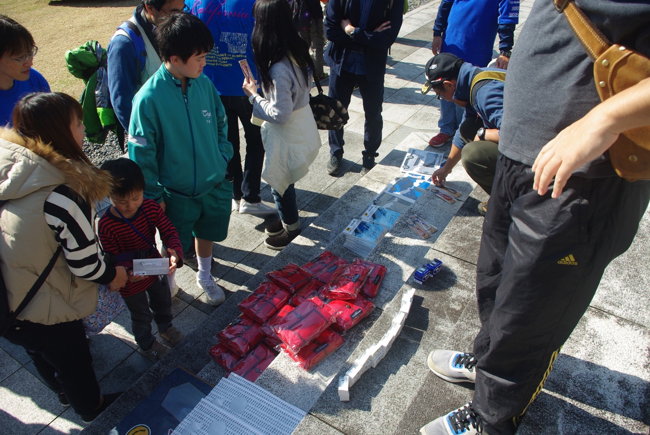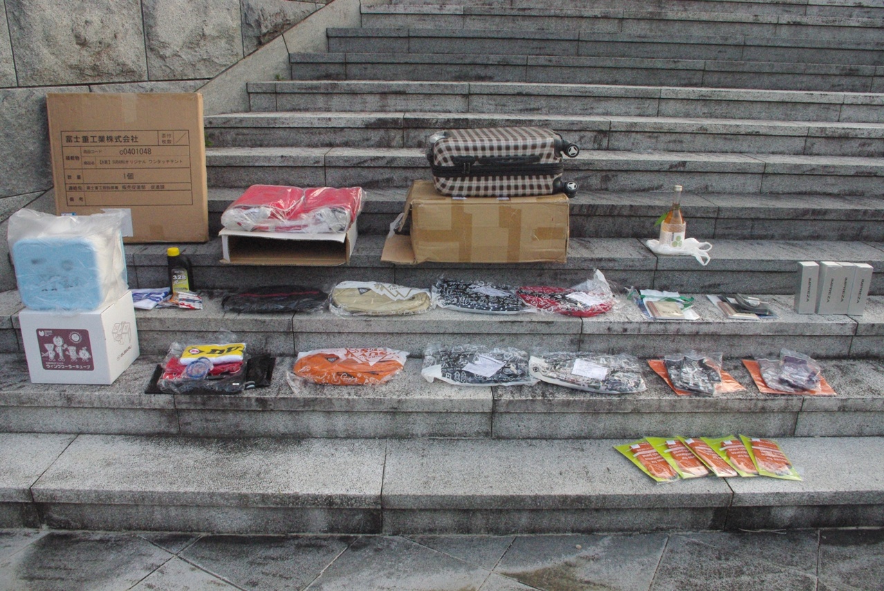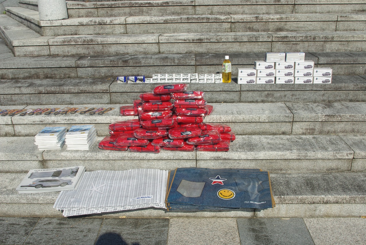 われわれスタッフが集めたスバルノベルティグッズや、参加メンバーの方々から寄せて頂いたスバルグッズなどをチェックして、計3回行われる各じゃんけん大会用に仕分け作業をしています。