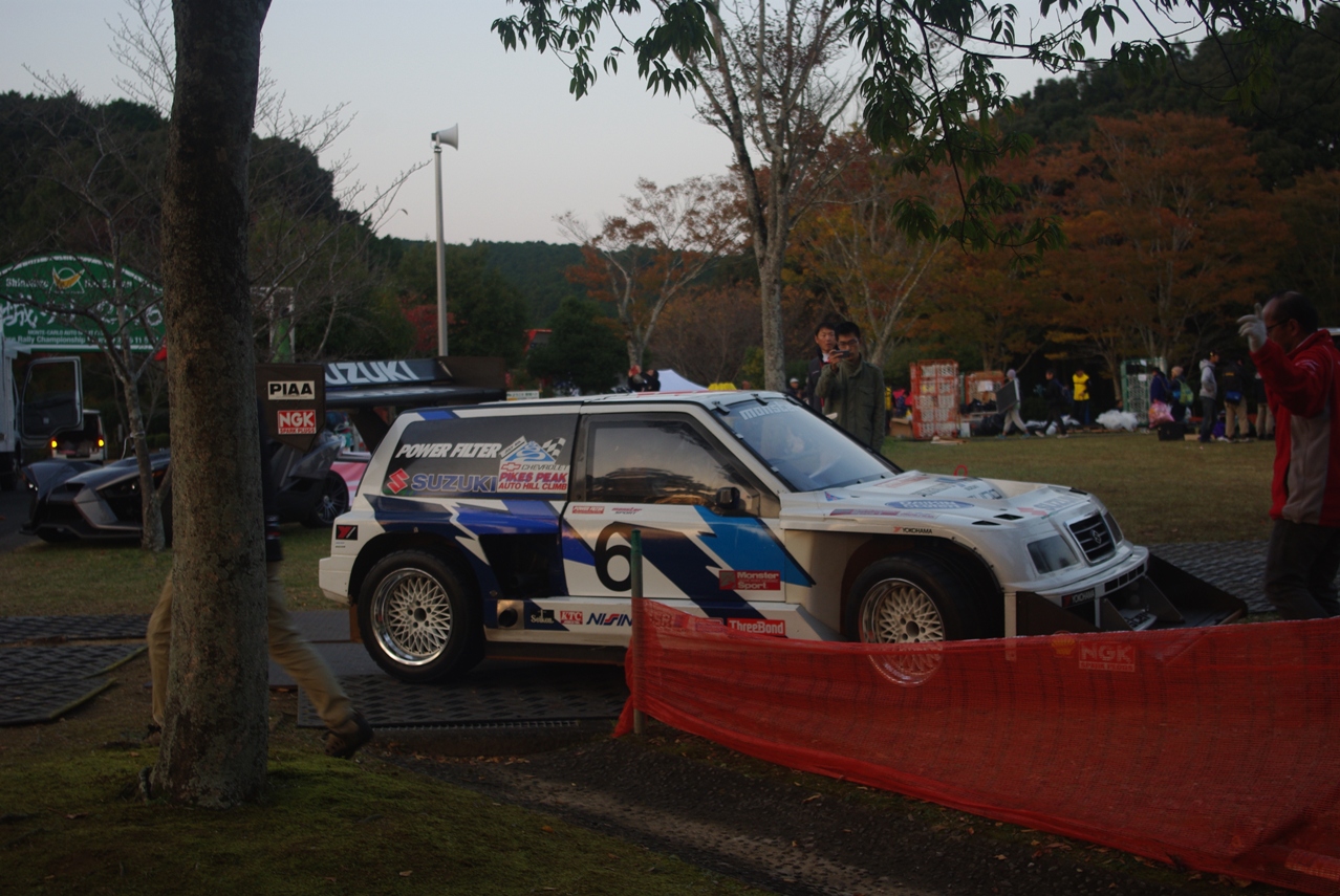 新城ラリーのデモラン常連ともいうべき、モンタジ こと モンスター田嶋 氏のスズキ エスクード パイクスピークスペシャル (V6-2000 TWIN-TURBO 800ps/1996年)が、丁度積車に載せて撤収するところでした。