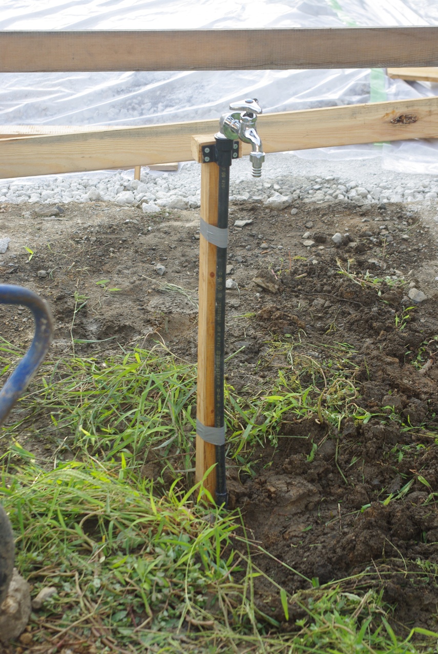そこで、明日からの基礎コンクリートの打ち込み作業に必要な水の確保のために、大工さんが簡易の立水栓を取り付けて下さいました。