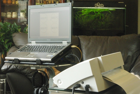 それが証拠に、レンズ台のリングストッパーの5本の爪に囲まれて、黄色のレンズが貼付ツールにセットされているのが判ると思います。