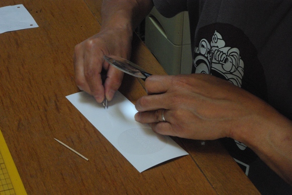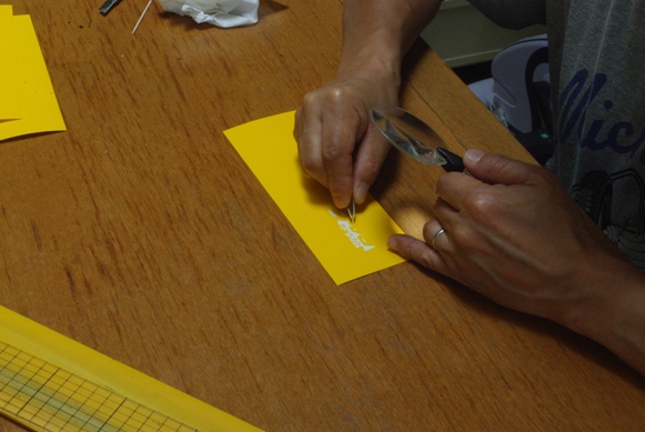 そこでこんな道具を使って、慎重に文字のアルミ部分にはみ出ている塗料を削り取ることにしました。