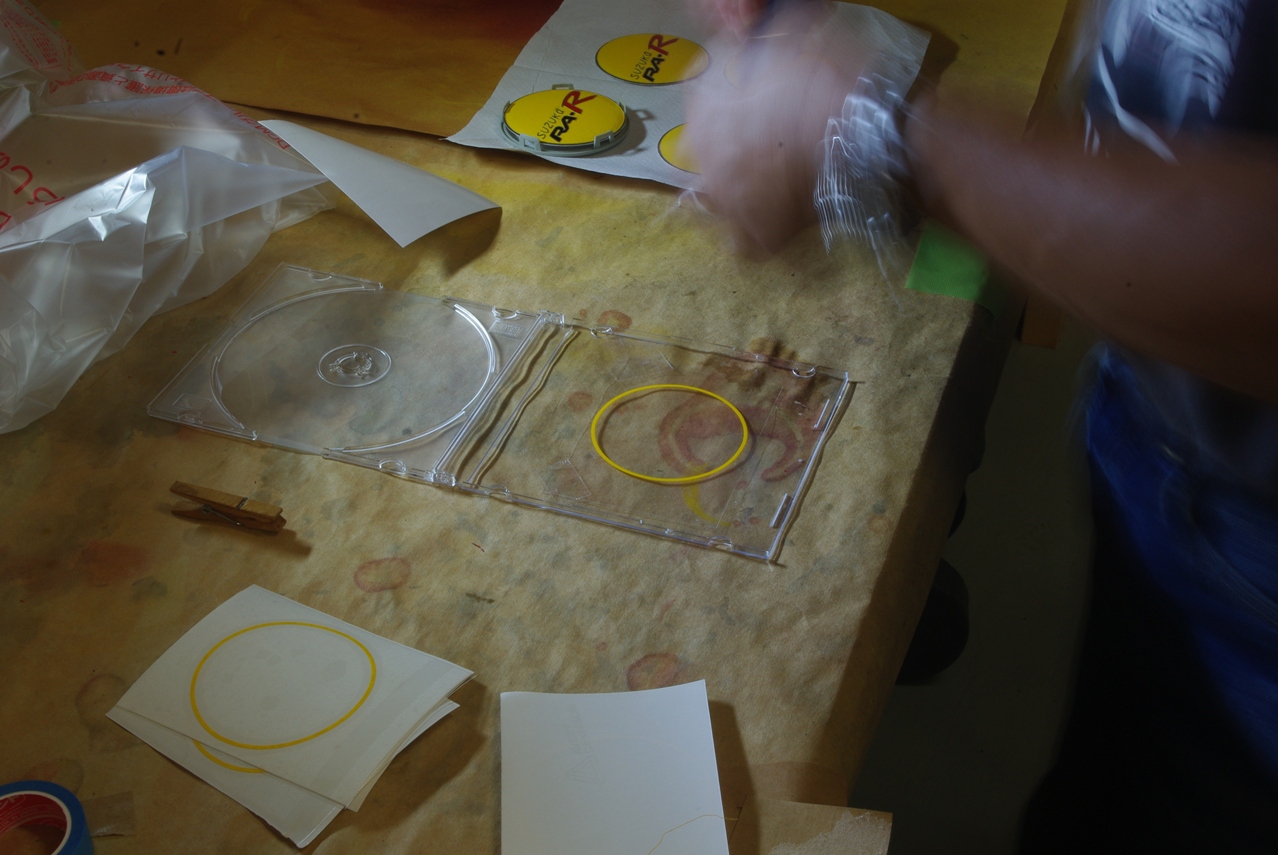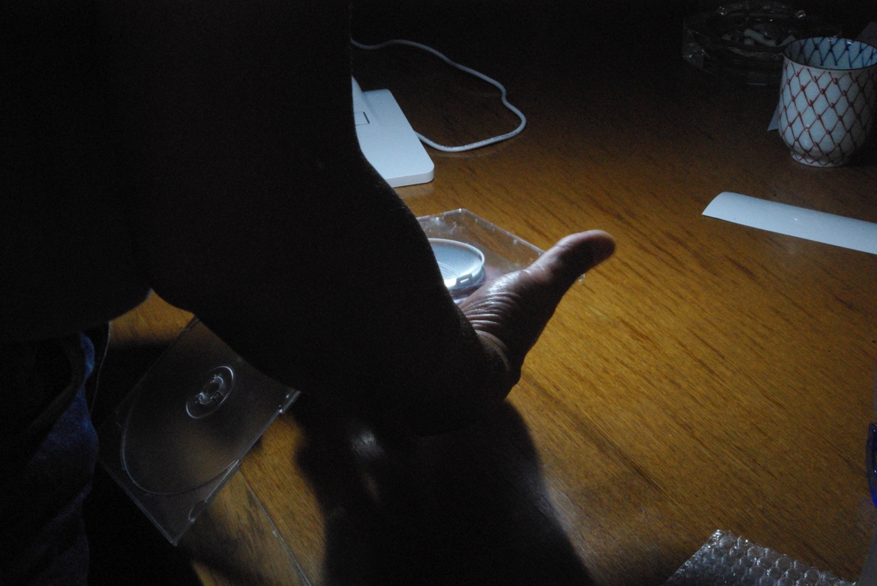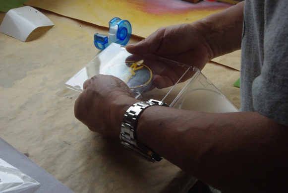 よく見ないと判りづらいと思いますが、実は手に持っている「マスキングシート精密貼り込みツール」のCDケースの蓋の裏にセロハンテープで貼り付けてある透明のシートがあるのが判りますか?