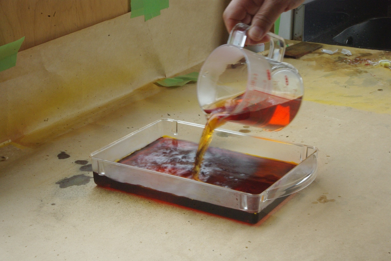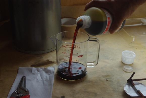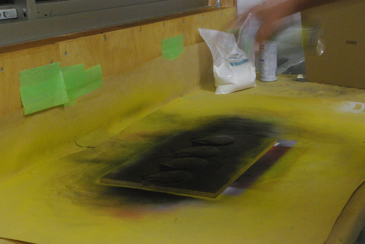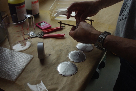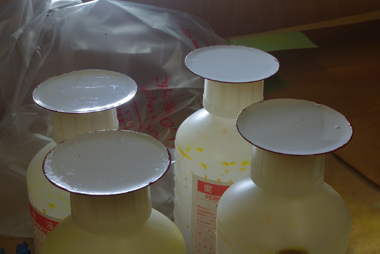 因みに、エッチング処理の終わった溶液は、バットに入れたままガレージ入口のコンクリートの敲きの上(屋外)に置いて、腐蝕液中和用の消石灰を充分に散布し、後で片付けるまでそのまましばらく放置します。