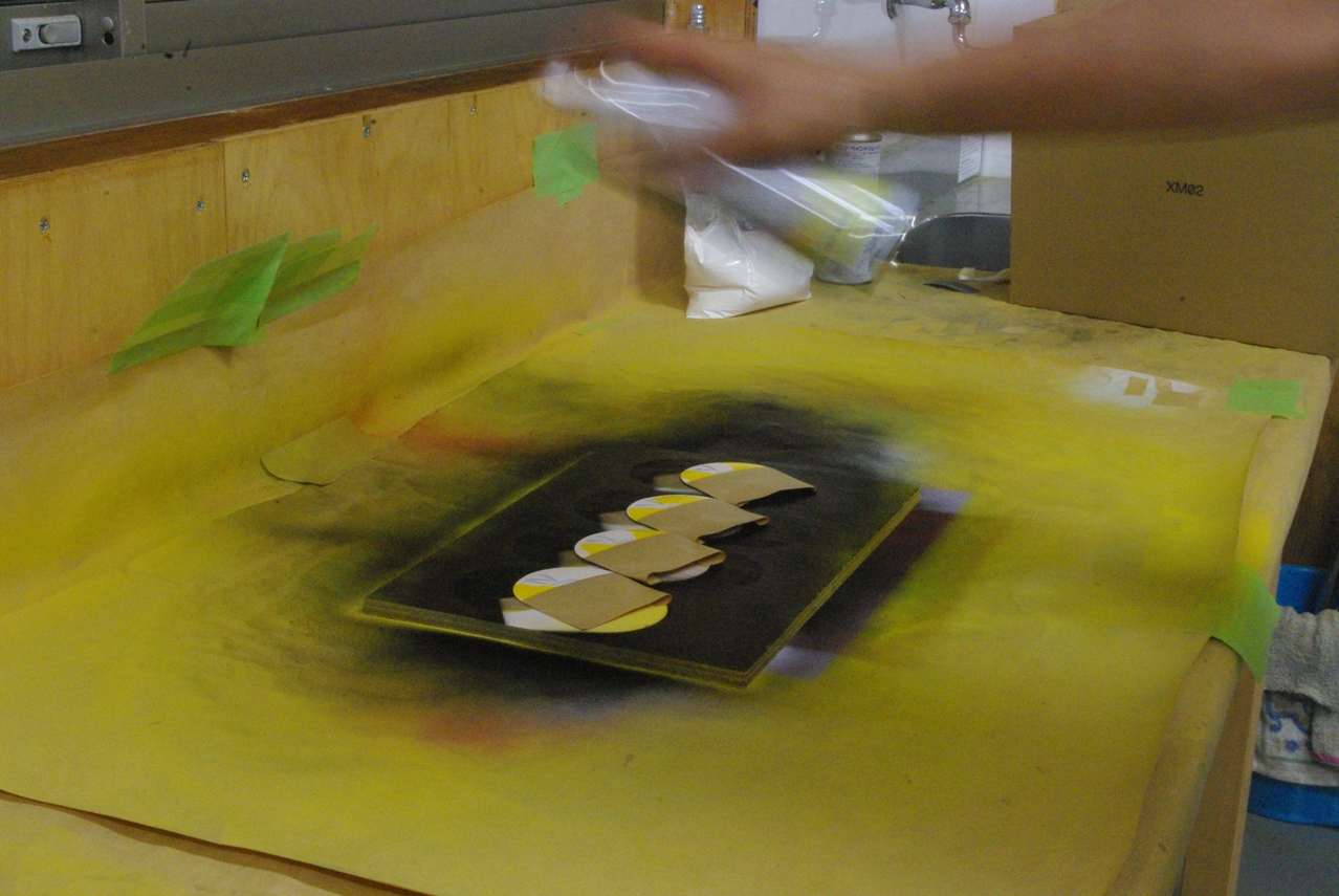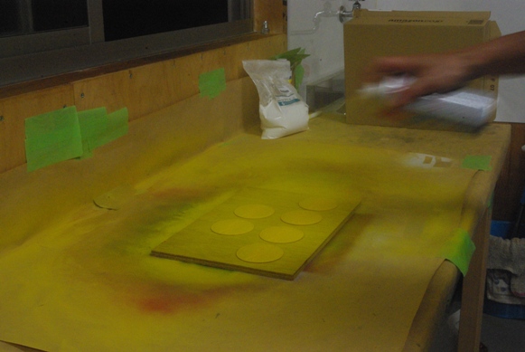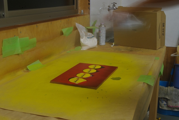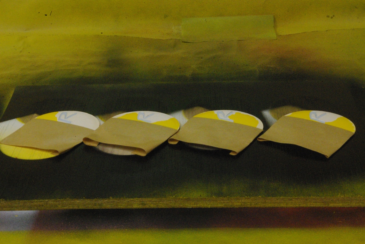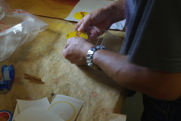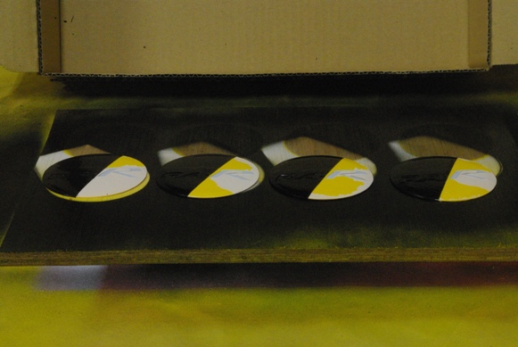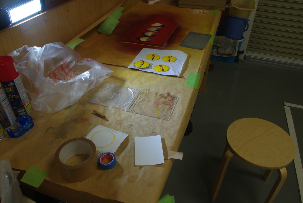 黄色いのは透けて見えている、たった今しがた背景塗装の乾燥を終えたばかりのレンズです。