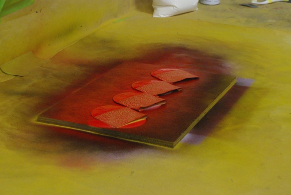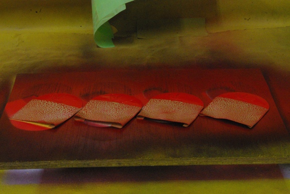 ちょっと良く見えませんが、小さな木片を耐水サンドペーパーで挟んで、背景部分の広いエリアだけ、800番の耐水サンドペーパー掛けをしました。